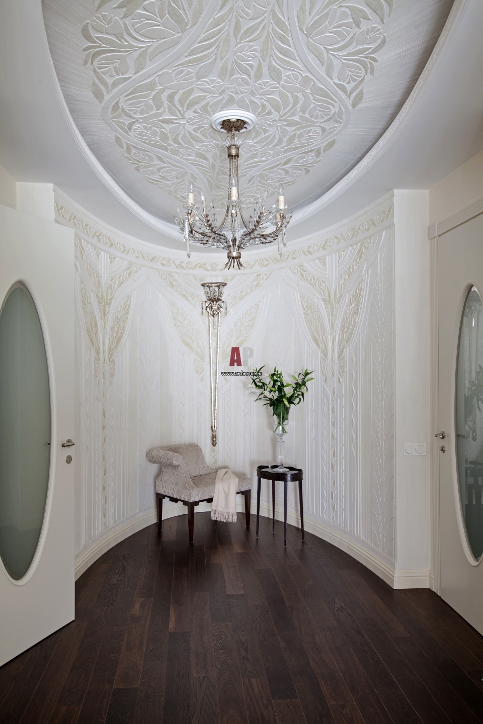 Овальный холл на балконе. Стены и потолок декорированы сложными барельефами по мотивам ар-деко и ар-нуво. Банкетка, столик, Global Views. Люстра, бра, Schonbek.
