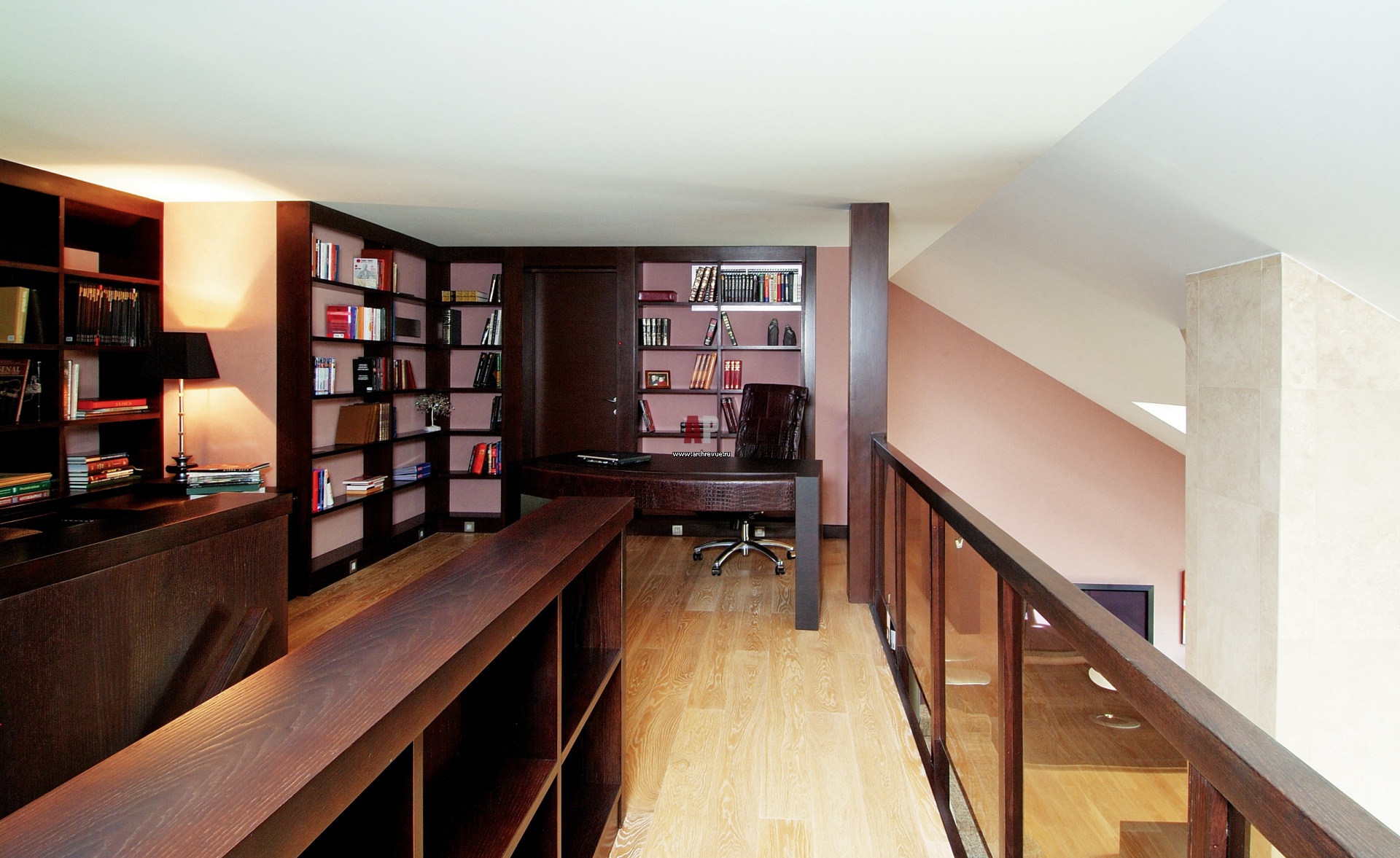 Хозяйский кабинет с библиотекой расположен на антресоли, прямо под коньком крыши. Мебель из темного дерева со вставками из кожи рептилий.