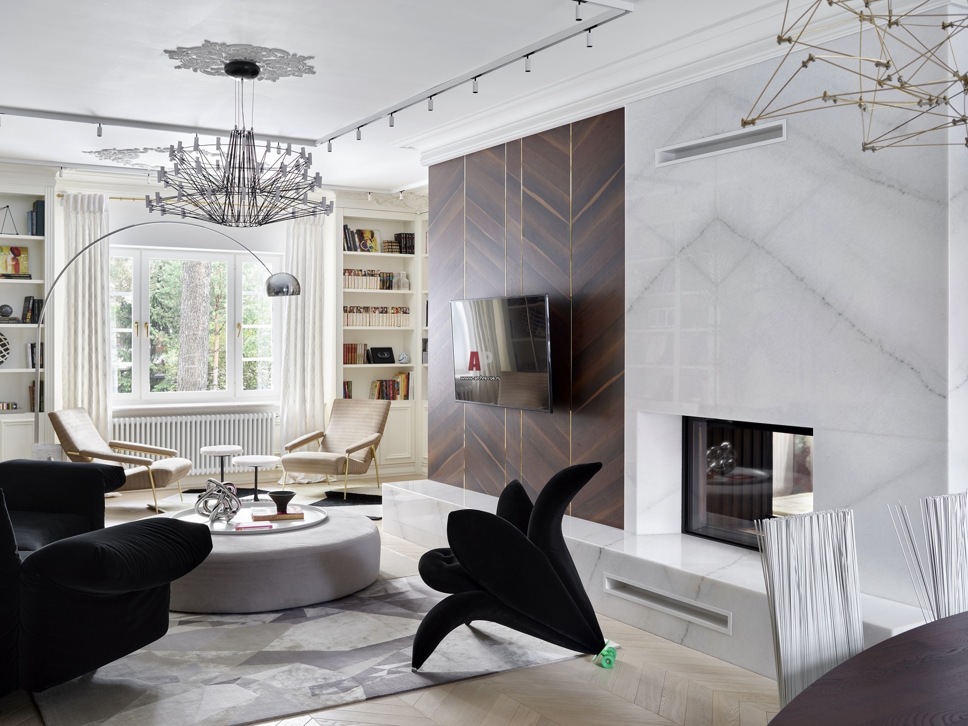 Каминная зона в гостиной. Кресло-цветок, Edra, модель Getsuen. Стена облицована шпоном эвкалипта. Камин отделан мрамором.