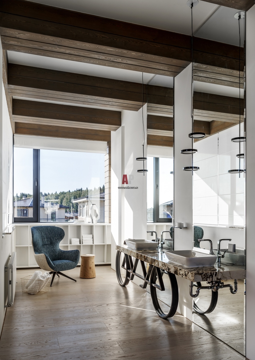 Ванная комната при хозяйской спальне. Кресло и столик, Poliform. Светильник, Marset. Умывальник сделан в форме велосипеда. Подстолье с колесами сварено из металла, столешница выполнена из кварцита, на нее установлены раковины Villeroy & Boch.