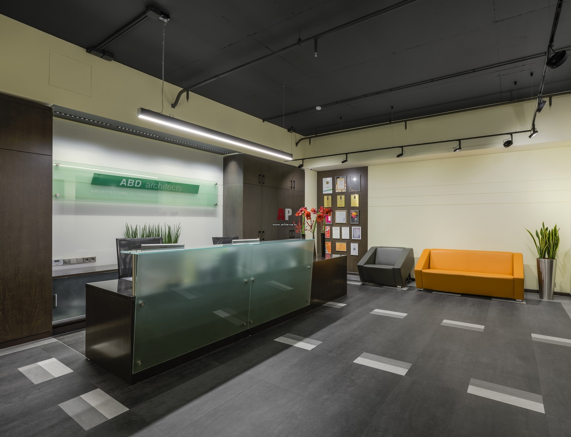 Фото интерьера офиса архитектурного бюро ABD architects. Ковролин с геометрическим рисунком задает офисному интерьеру ритм.