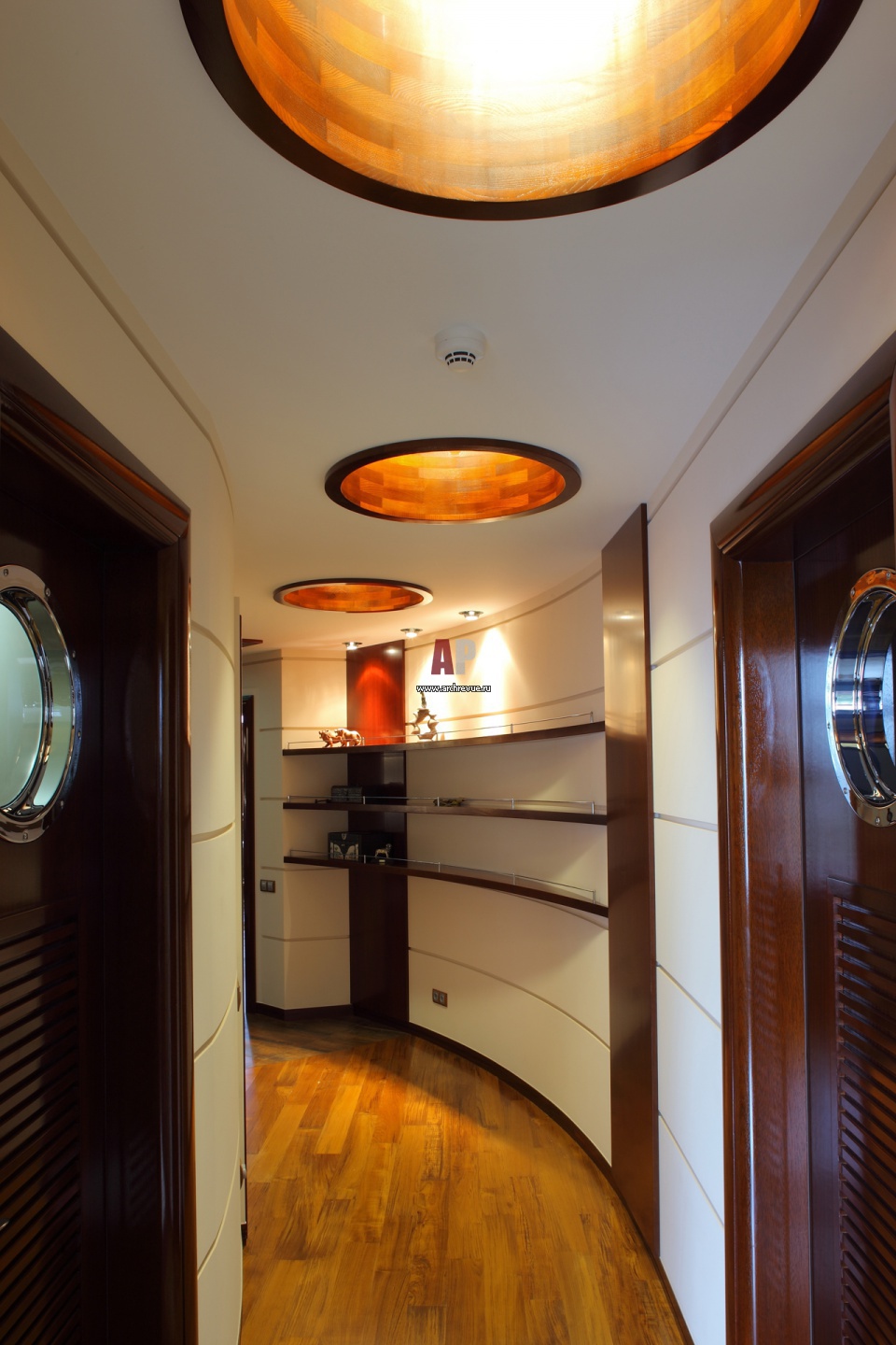 Дугообразный коридор, светильники-иллюминаторы утоплены в потолок. Двери из красного дерева с окнами-иллюминаторами.