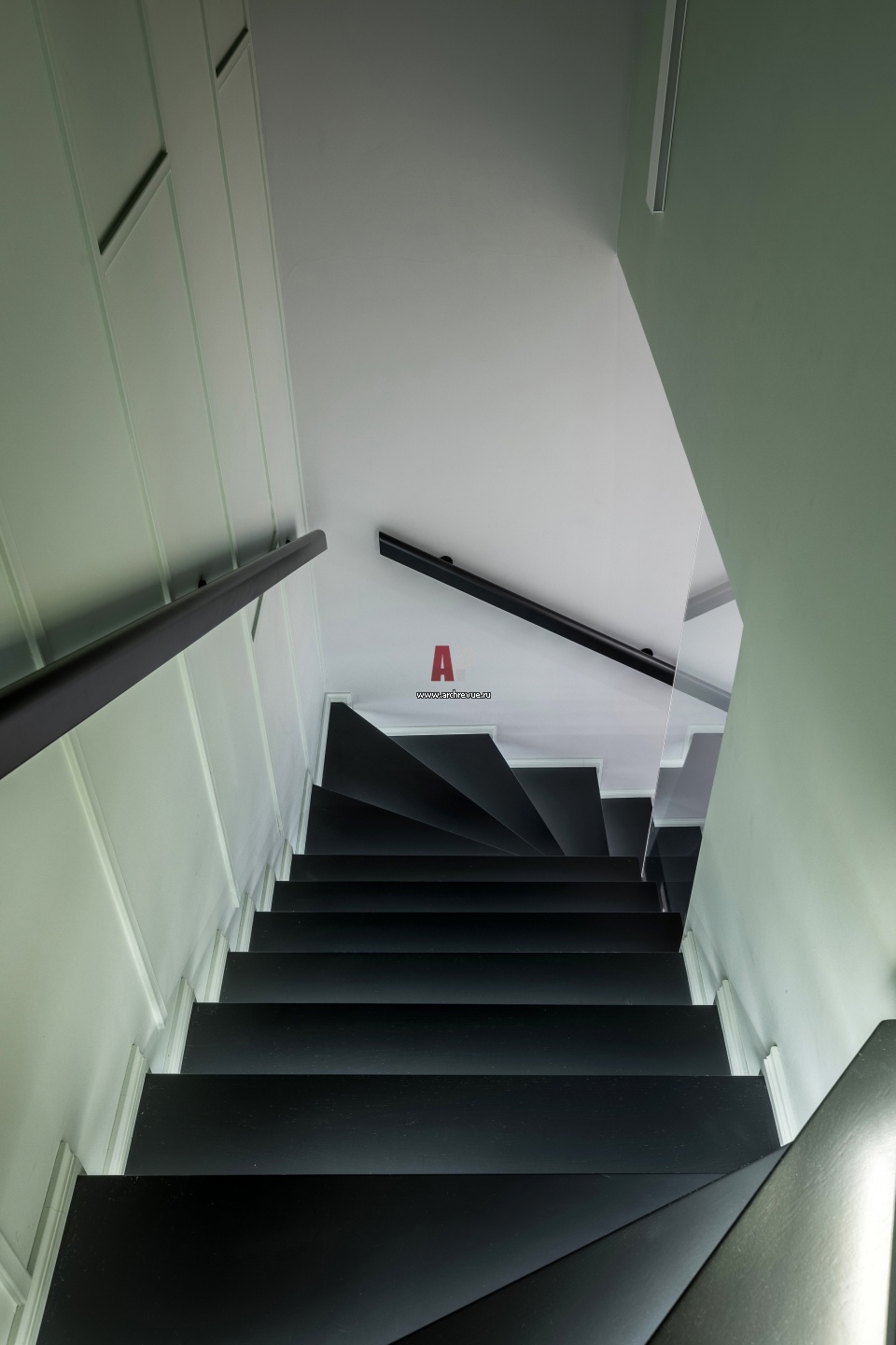 Двухэтажная квартира с зелеными стенами для отдыха. Лестница выполнена по эскизам дизайнера.