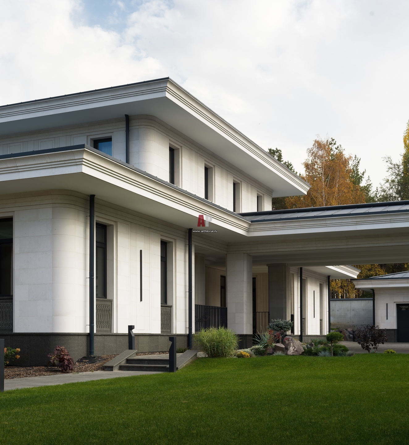 Сочетание современной и классической архитектуры нашло отражение в строгих формах, которые органично связаны с изысканным орнаментом декора и плавными текучими линиями фасадов.