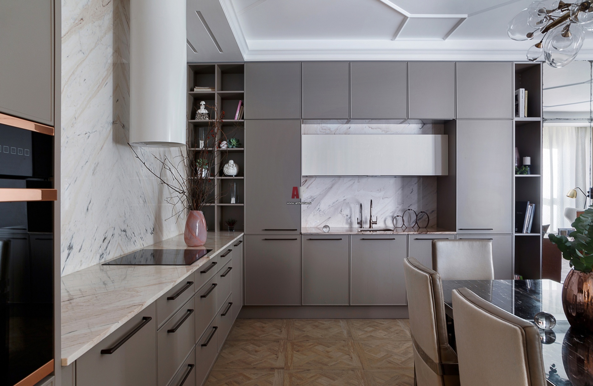 Объединение двух квартир в Перми. Интерьер кухни. На фартуке – итальянский мрамор Палисандро Классико (Pallisandro Classico).