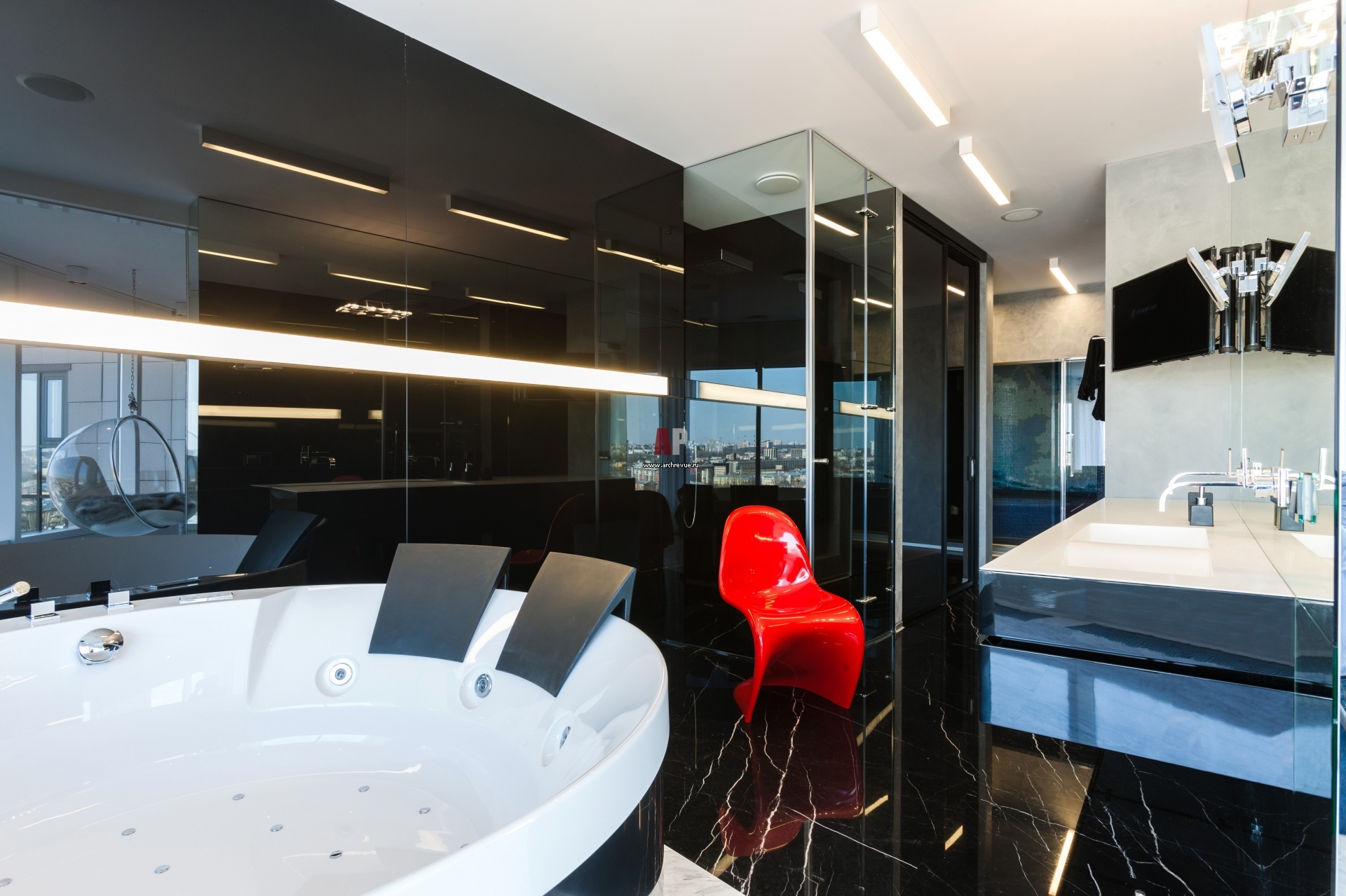 Интерьер мужского санузла в черно-белой гамме. На стенах и полу – природный камень с полировкой. Круглая ванна с гидромассажем, Hoesch.