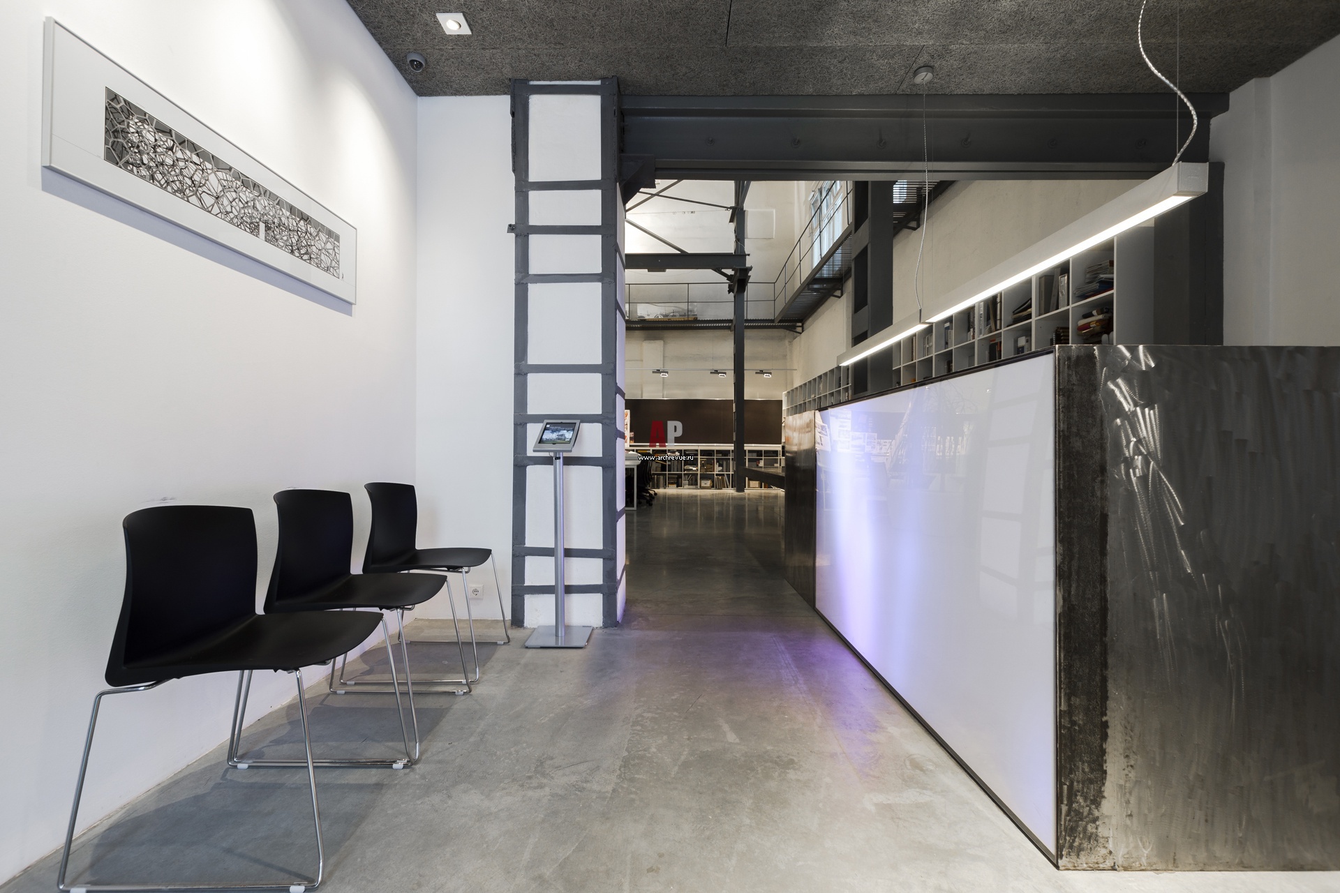 Входная зона с приемной и респешен. Стойка ресепшен выполнена из отшлифованного металла. Ее фасад оформлен светодиодной световой панелью Philips с возможностью вывода на нее динамического изображения. Видеоизображение управляется через wi-fi с любого устройства.