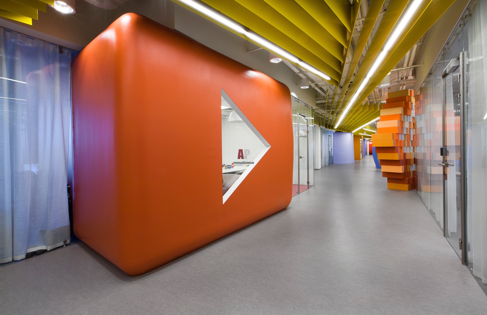 Интерьер холла. В пристроенных ярких объемах располагаются разнообразные сервисы офиса. Например, здесь находится малая переговорная. Авторы проекта Петр Зайцев, Арсений Борисенко, архитектурное бюро za bor.