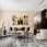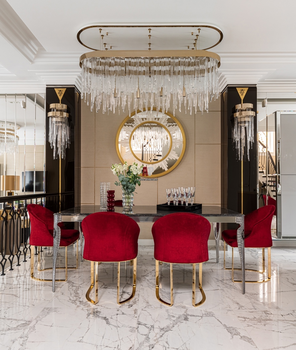 Парадная столовая. Обеденный стол с мраморной столешницей Black Cosmic, Visionnaire, модель Chatam. Стулья в обивке красным бархатом, Longhi, модель Daphn. Люстры и бра из позолоченных колец и кристаллов ручной работы, Luxxu, коллекция Babel.