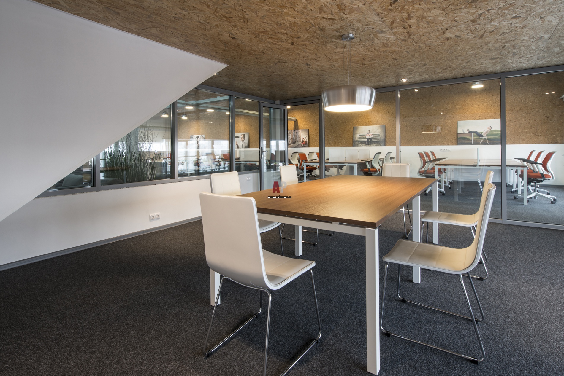 Большая переговорная находится за стеклянными перегородками. Динамичная форма сформирована листам гипсокартона, «КНАУФ». На потолке – плиты OSB (из прессованной стружки), без финиша.