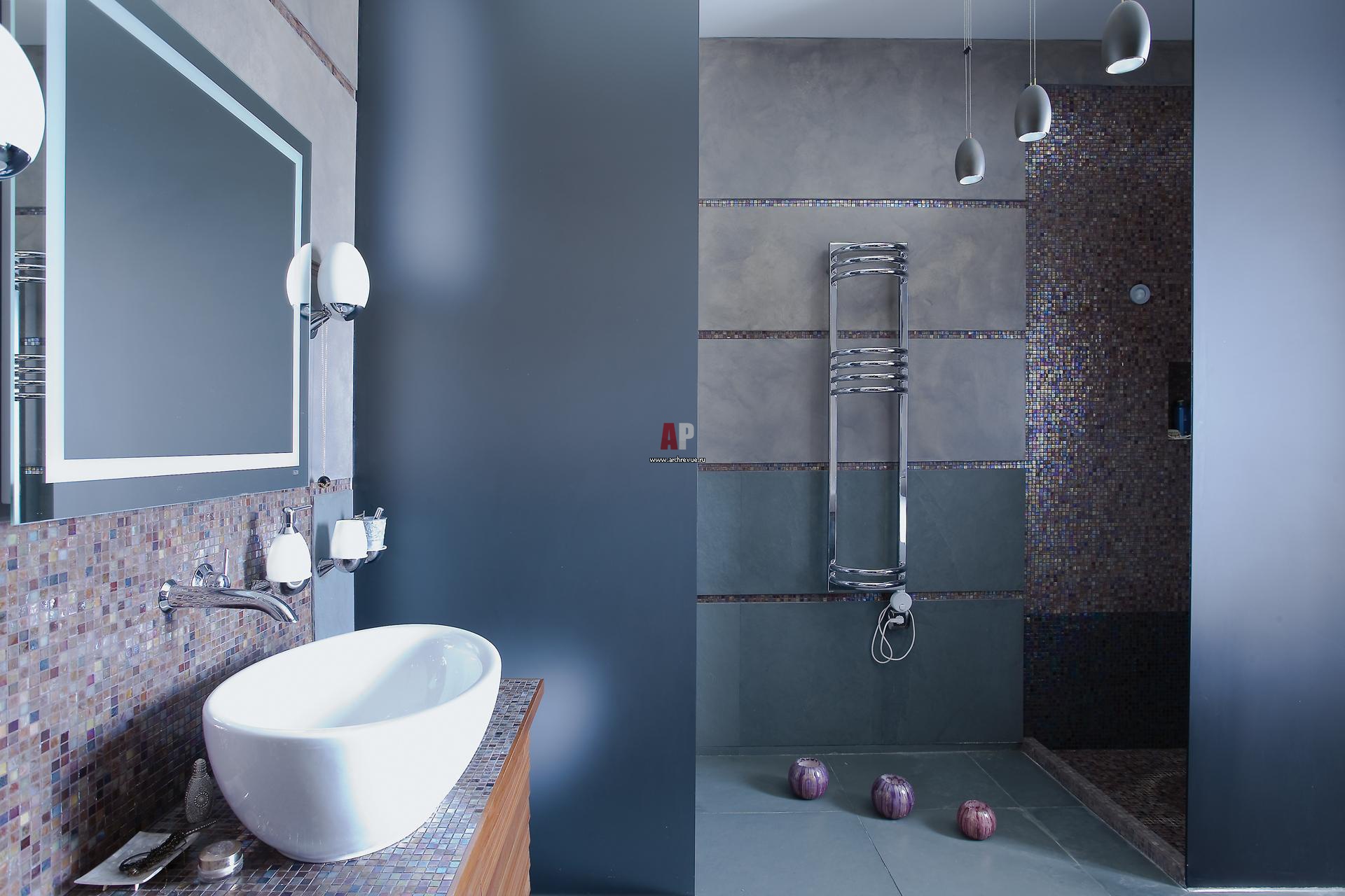 В интерьере санузла автор использует микс из мозаики, поставщик «Шик на Новодевичьем», керамогранита и стекла