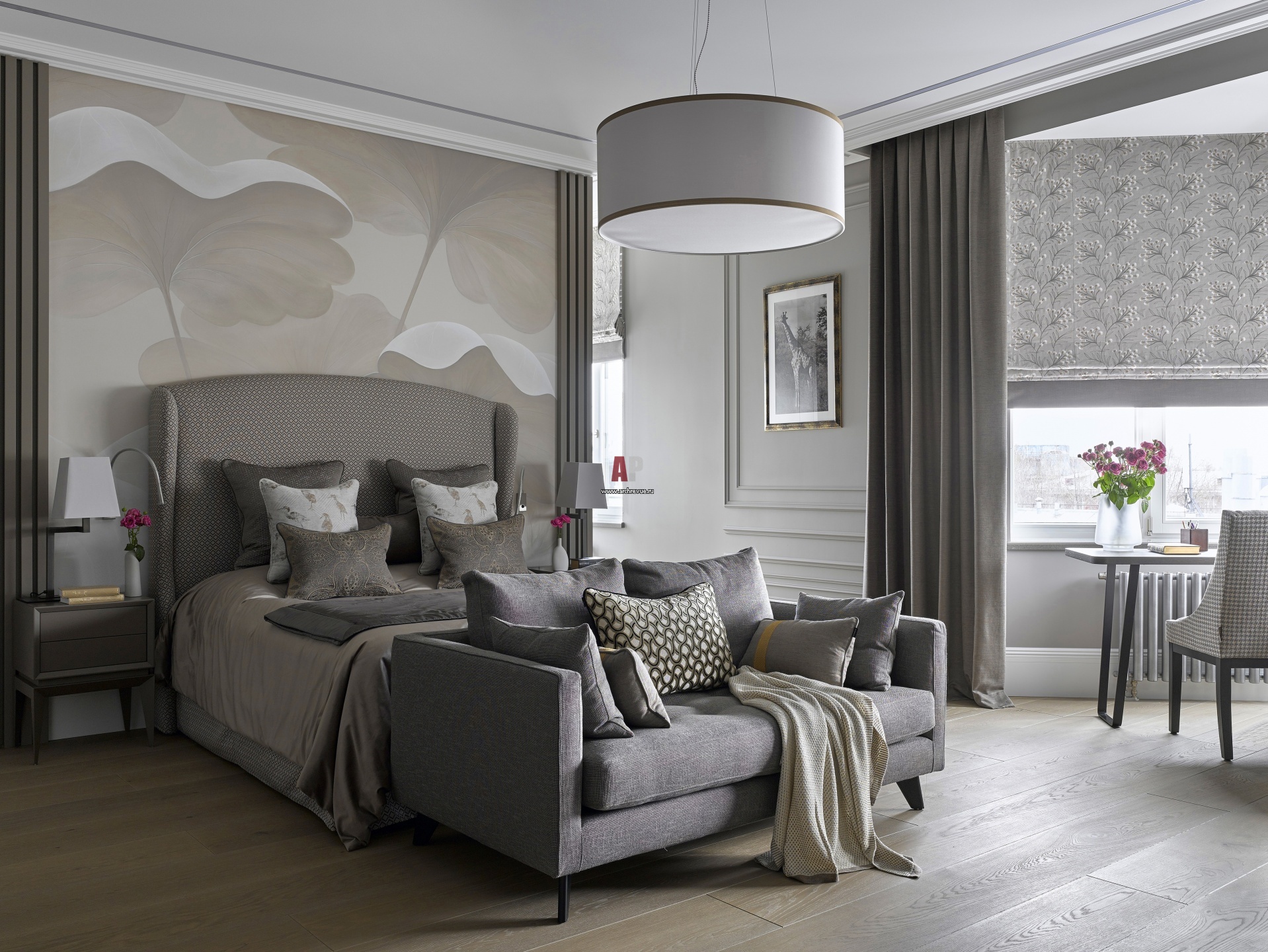 Комната дочери. С двух сторон от кровати организованы входы в гардеробную. Стена оформлена обоями ручной работы с крупным растительным рисунком. Кровать TreCi Salotti со стилизованными классическими «ушами». Диван, Marac. Письменный стол, Alf DaFre. Круглый центральный светильник масштабирует помещение.