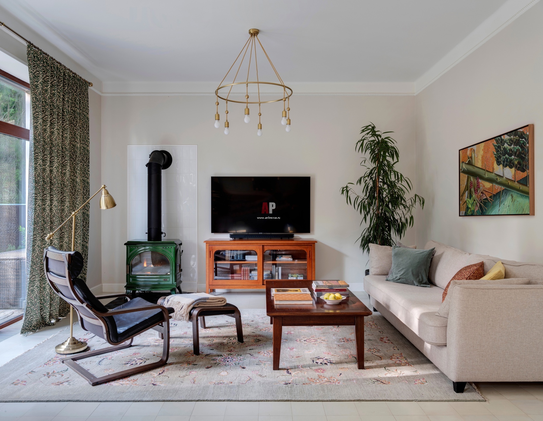 Зона гостиной в общем пространстве первого этажа. Чугунная печь, Godin. Мебель, винтаж. Шторы сшиты из ткани с растительным узором, Morris & Co. Над диваном – картина «Ятрышник» художника Яра Пикулева. Люстры созданы по мотивам светильников начала прошлого века сразу трех архитекторов: Федора Шехтеля, Йозефа Хоффмана и Адольфа Лооса.