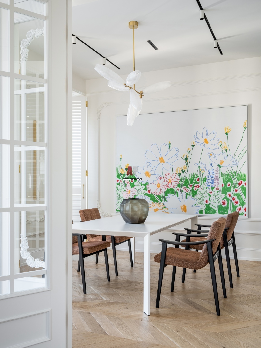 Вид из гостиной на кухню-столовую, оформленную в нейтральной белой гамме. Яркий акцент зоны - картина работы Алексея Дубинского.