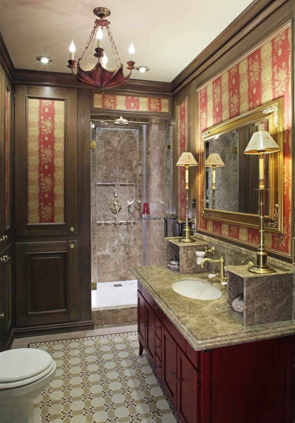 Фото интерьера санузла в английском стиле. Торжественность интерьеру придают буазери из темного дерева в сочетании с метлахской плиткой и обоями от Marvic Textiles. Столешница раковины и душевая облицованы серым мрамором.