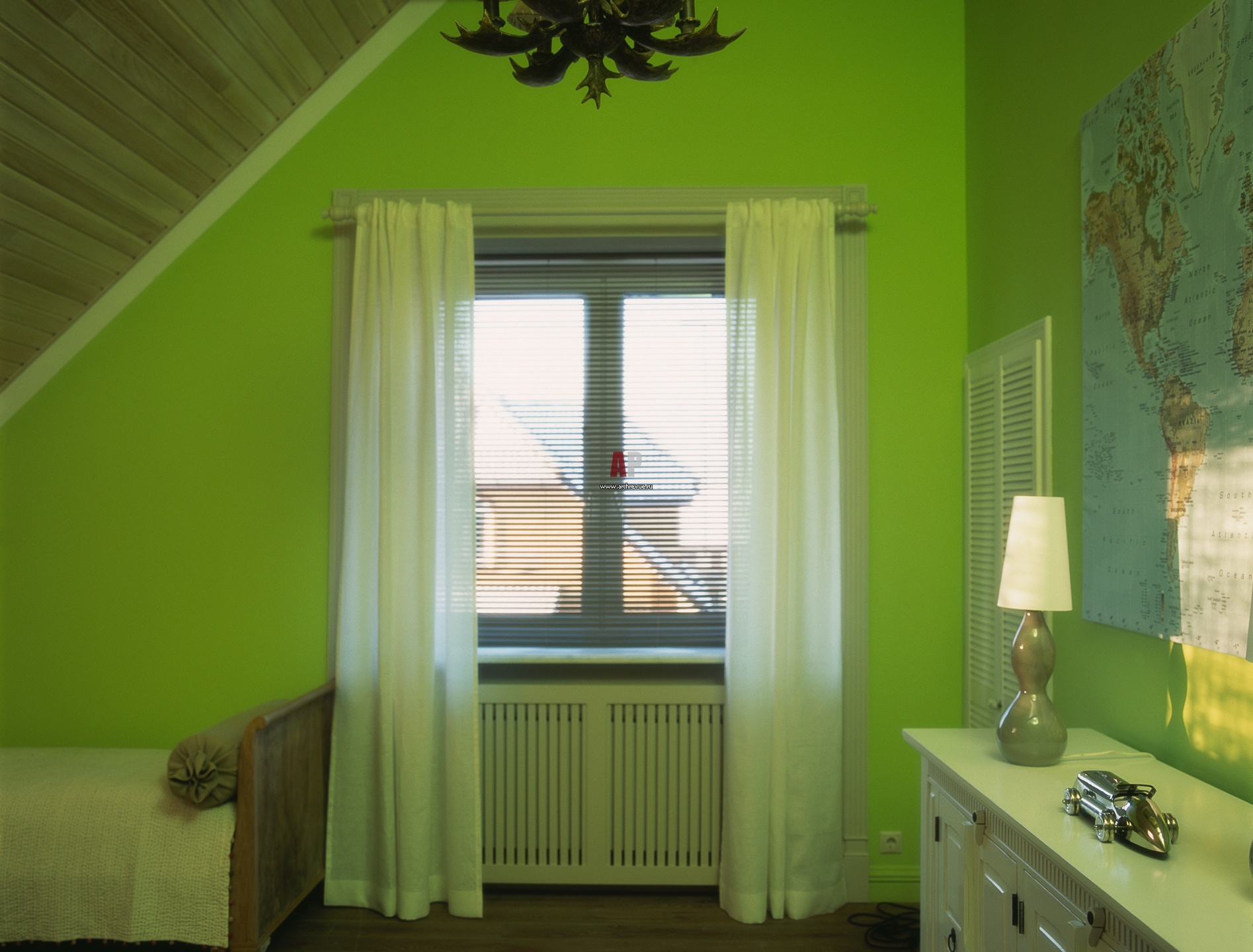 Детская решена в фосфоресцирующем зеленом цвете. Потолок мансарды зашит лиственницей, на полах – массивная доска из копченого дуба.