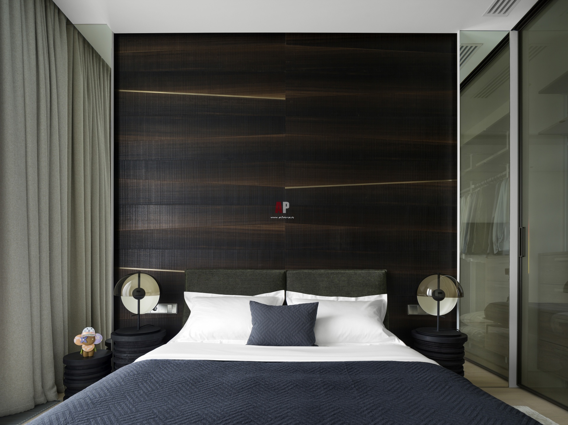 Гостевая. За изголовьем кровати – темные деревянные панели с 3Д-эффектом и латунными вставками. По периметру встроена подсветка. По бокам – зеркала до потолка. Прикроватные тумбы Baxter, модель Bidu.