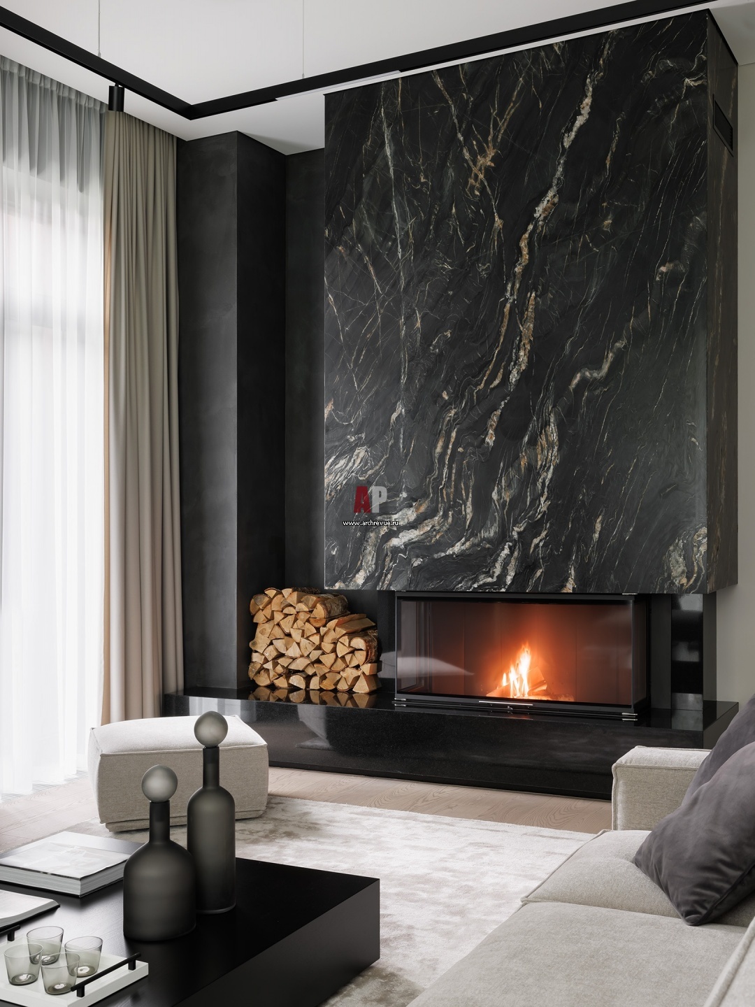 Камин выглядит монументально. «Я не хотела видимых швов, поэтому искала цельный камень. Бразильский каменный слэб с глянцевой фактурой и рисунком, имитирующим прожилки дерева, прекрасно вписался в лаконичный интерьер гостиной», - рассказывает автор проекта.