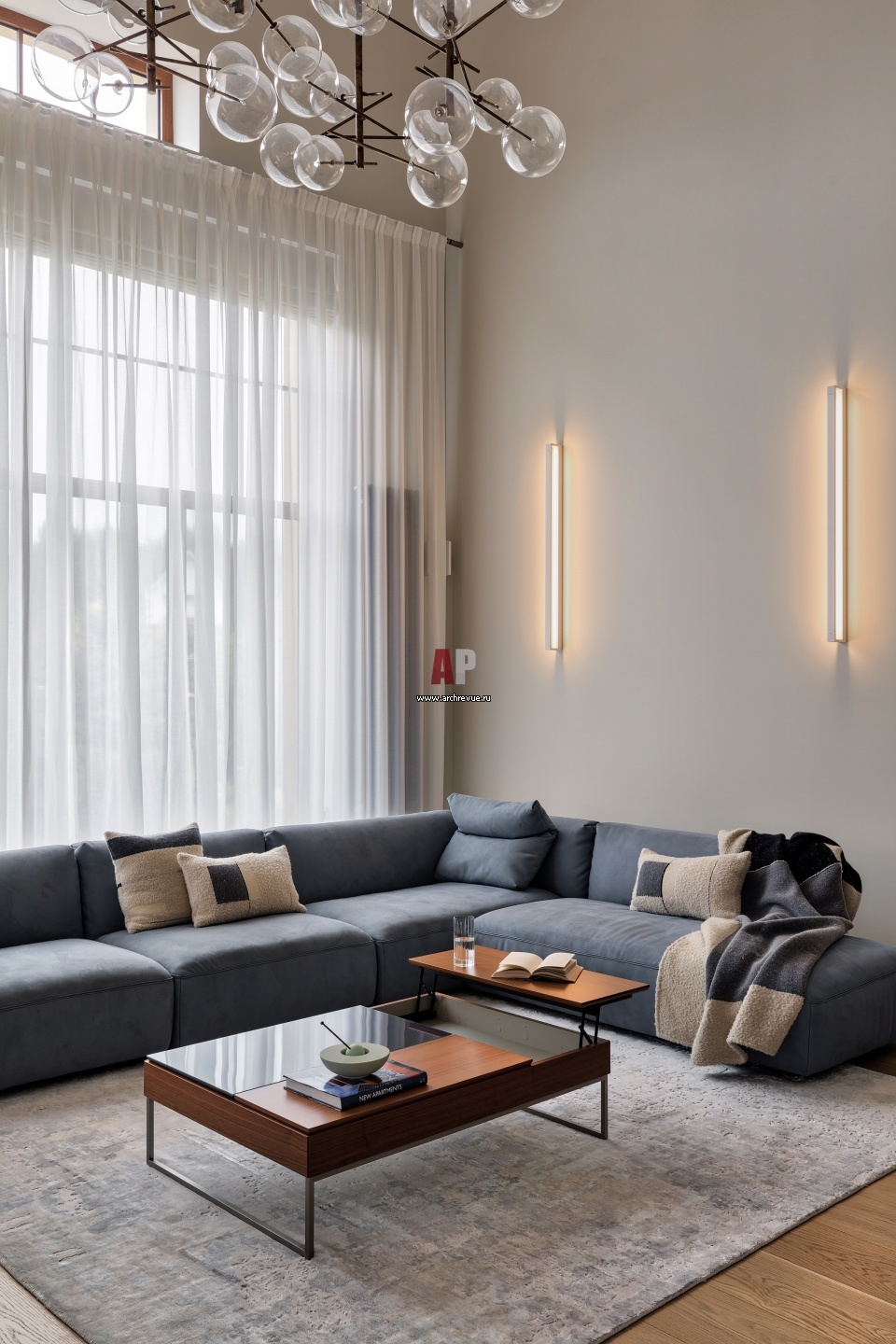 Однотонные светлые стены служат фоном для дизайнерских светильников и современной мебели. Бра, Centrsvet.