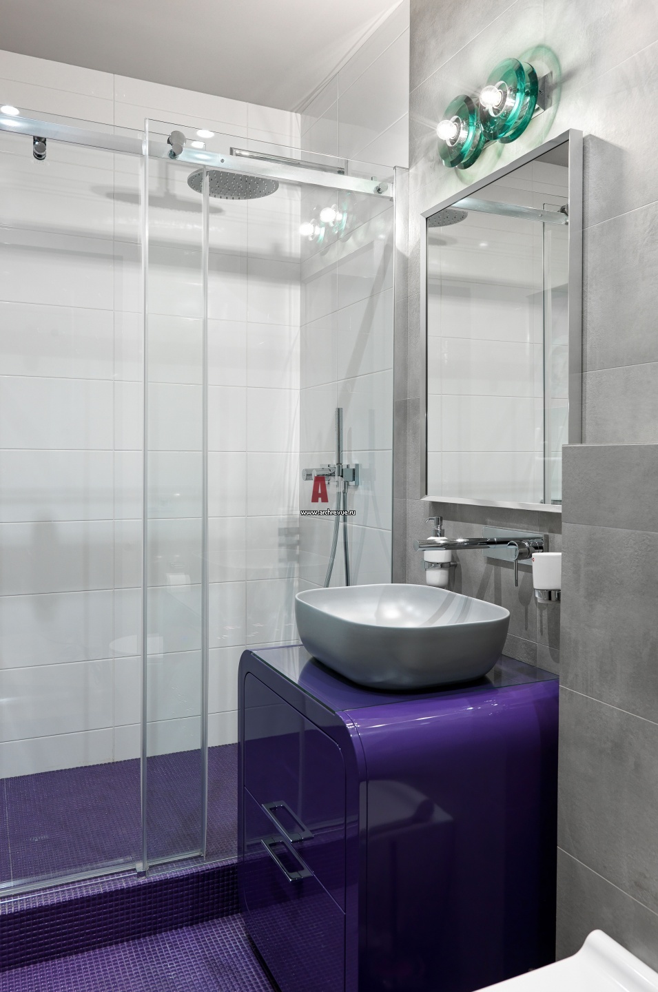Декоративная тема детского санузла – космос. Умывальник сделан на заказ с учетом эргономики: его края сглажены, а столешница оформлена стеклом, вставленным заподлицо с деревянной поверхностью. Материалы: МДФ под суперглянцем. Раковина, GID. Душевое ограждение, Vegas Glass. Серая плитка, CE.SI. Фиолетовая мозаика, Mosavit.