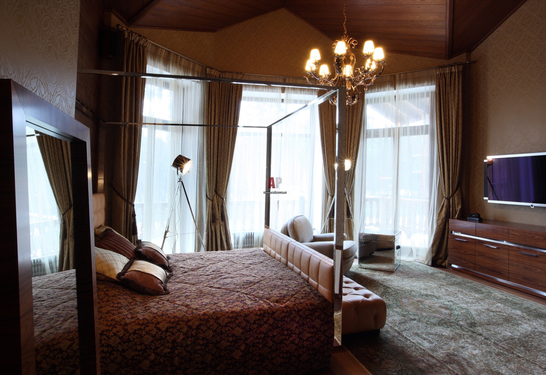 Особенность каждой спальни дома – пышно декорированные потолки. Они оформлены деревом, лепниной росписью.