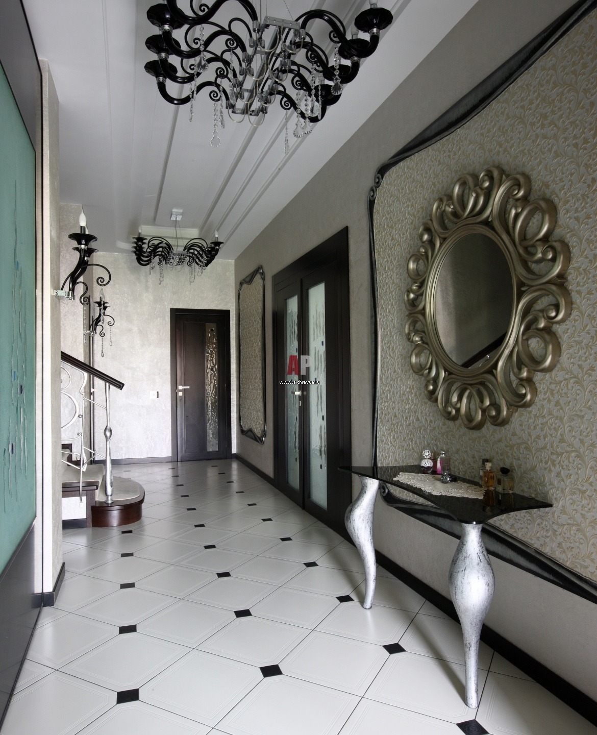 Интерьер входной группы частного загробного дома. Зеркало, консоль в серебряной отделке, EGO. Светильник, Barovier & Toso.