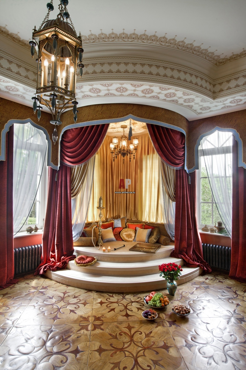 Интерьер кальянной. На полу – художественный паркет из восстановленной исторической древесины дуба с инкрустацией черепицей. Шатер на подиуме украшен ступенчатыми карнизами с филигранной росписью. Потолок оформлен росписью в восточном стиле. Светильники-фонари, Fine Art Lamps.