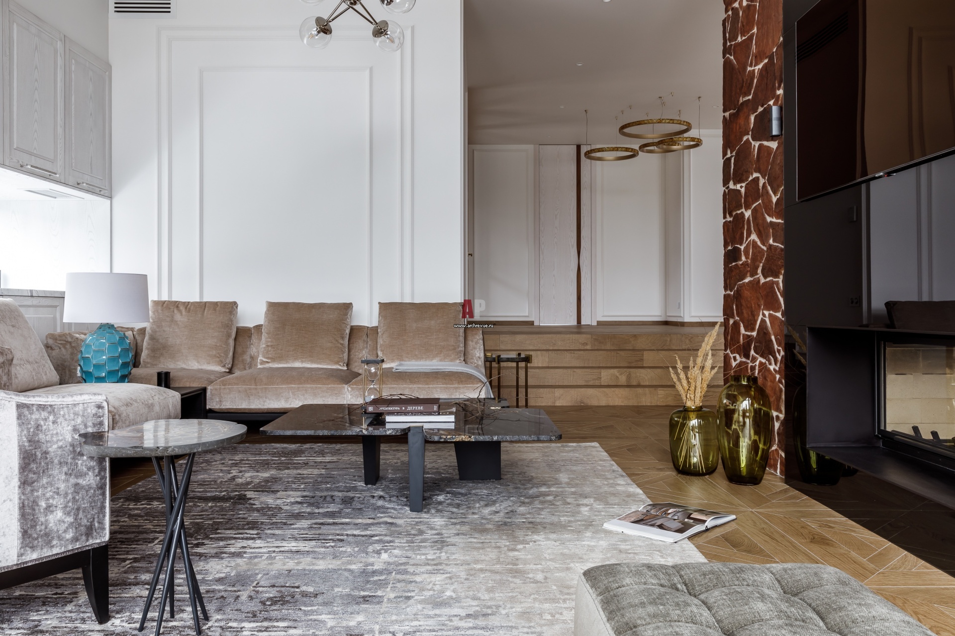 Гостиная выполнена в светлой палитре. На полу – паркет из натурального дуба под маслом, уложенный масштабными щитами. Угловой диван, Flexform. Журнальные столы, Eichholtz.
