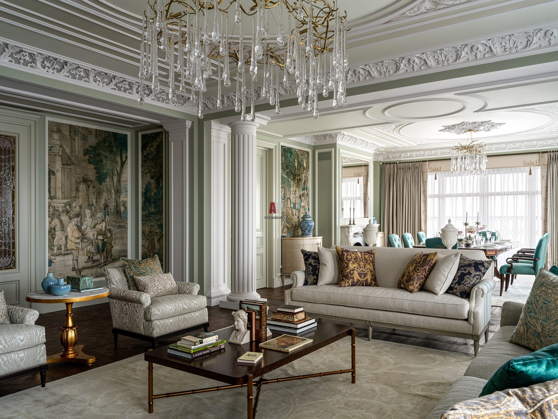 Хорошие исходные масштабы пространства позволили использовать весь арсенал парадной классики: паркетные полы, колонны с пилястрами, лепные карнизы и розетки, потолочные фрески и гобелены.