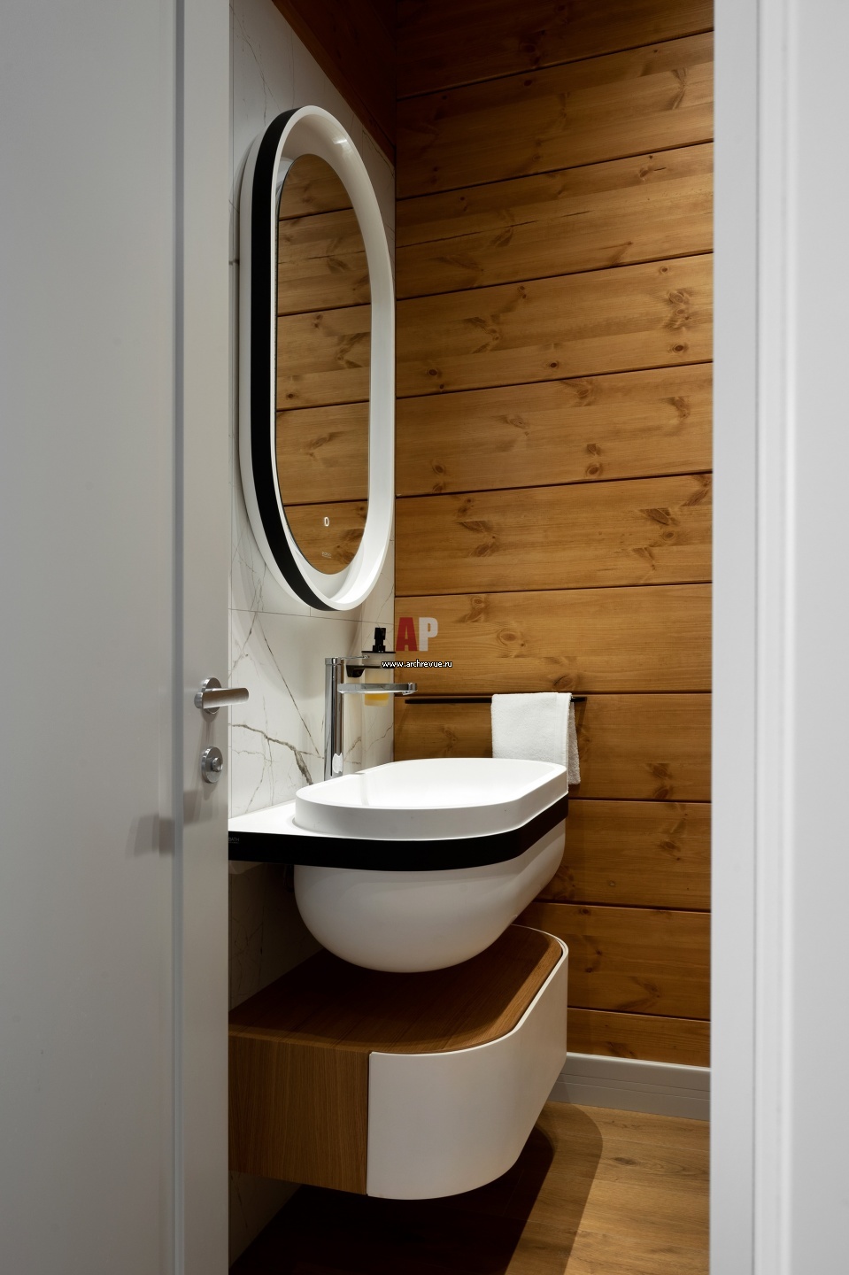 Современный деревянный дом для трех поколений семьи. Гостевой санузел. Керамогранит, Imola.