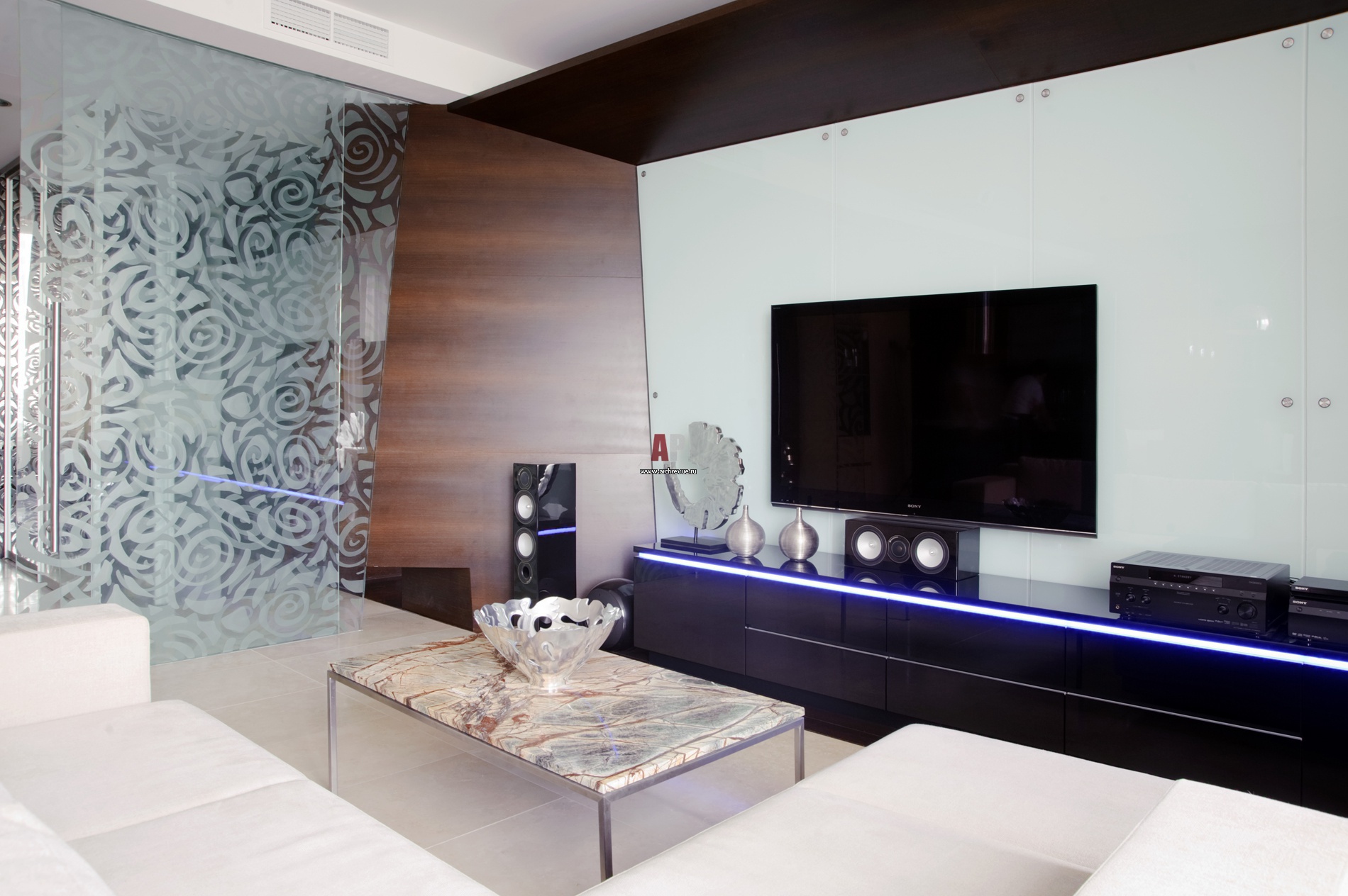 Гостиная отделена от прихожей стеклянными перегородками. Авторы проекта Петр Зайцев, Арсений Борисенко, архитектурное бюро za bor. На стеклянные полотна методом гравировки перенесен орнамент итальянской керамики Petracer’s из коллекции Tango Rock.