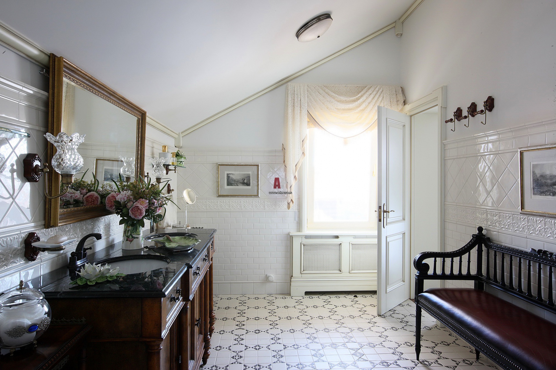 Ванная комната в традиционном английском стиле.Пол выложен цементной плиткой, TopCer. Стены облицованы белой керамикой, Ceramiche Grazia. Умывальник из мореного дуба, Maitland Smith. Гравюры XIX века. Все – поставщик Charles.Cameron.