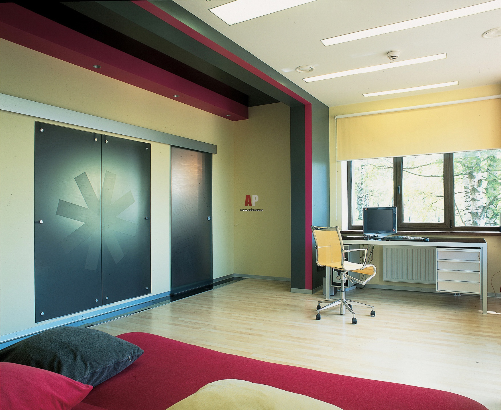 Современный интерьер детской комнаты с красными декоративными акцентами. За перегородками из матового стекла находится ванная комната.