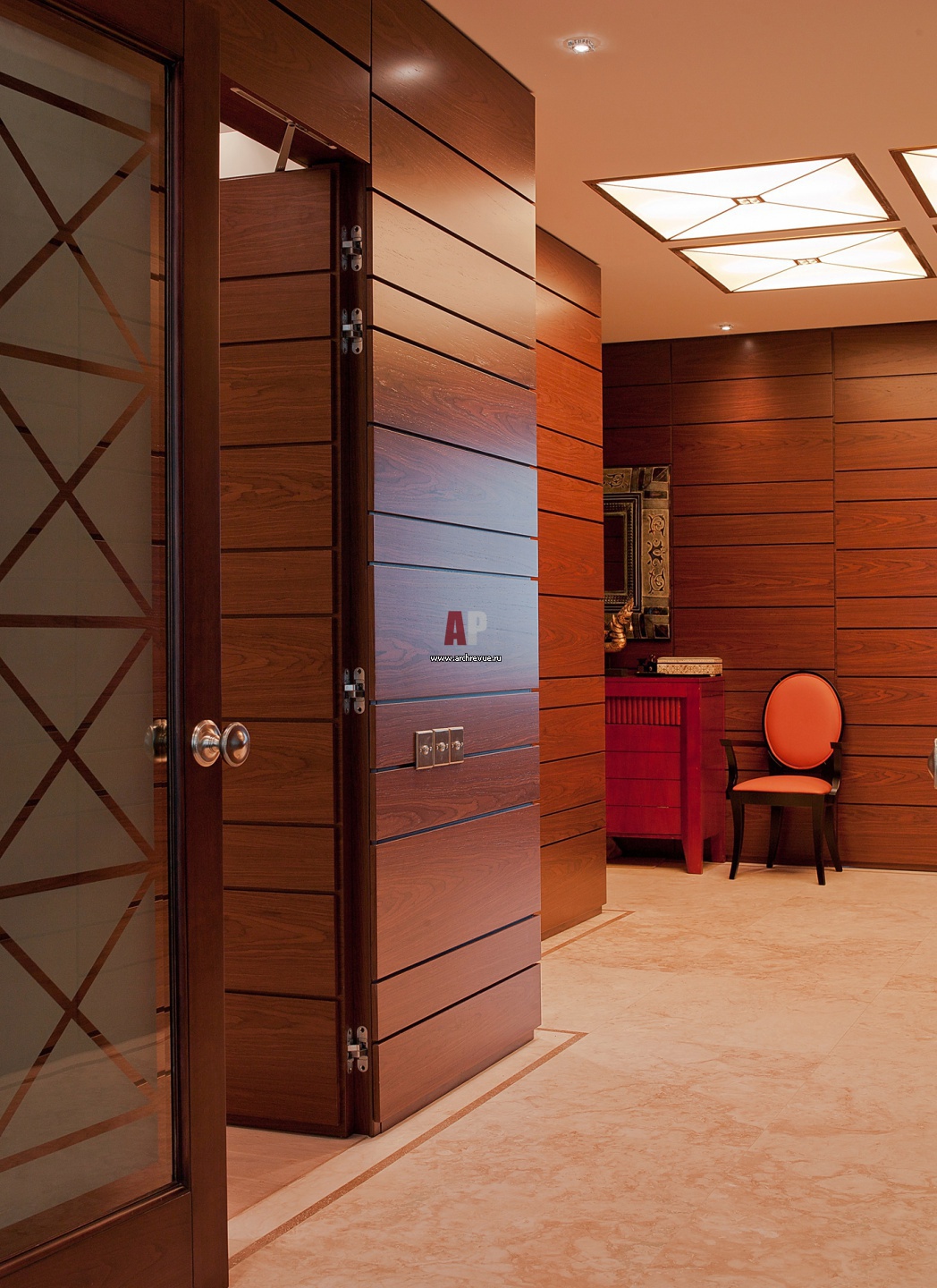 Интерьер прихожей. На стенах - рустованные панели из шпонированной вишни. Изделия из дерева выполнены на заказ по эскизам архитекторов, производство TAGinterio.