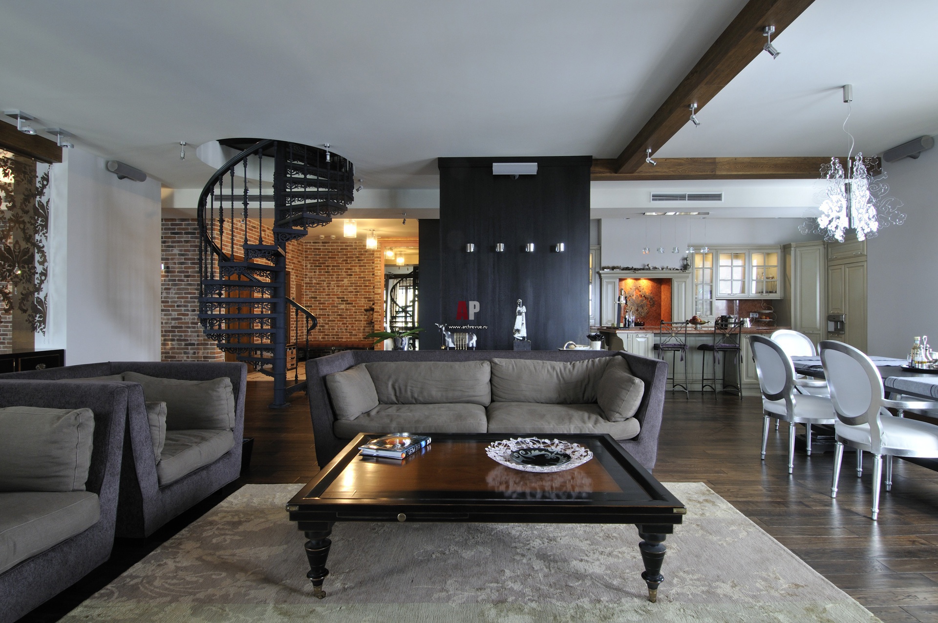 В оформлении гостиной зоны автор использует несколько приемов. Сочетание открытых поверхностей из кирпича, отштукатуренных и выкрашенных в разные цвета стен, краска «Бекерс», художник Николай Богатырев, дубовой доски на полу, поставщик «Паркет-Холл», и деревянного декора на потолке
