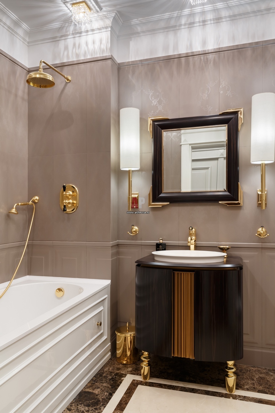 Санузел при гостевой спальне. Кофейного цвета плитка и мраморный пол сочетаются с золотыми аксессуарами. Умывальник в стиле ар-деко из экзотических пород дерева, Karol, коллекция Bania.