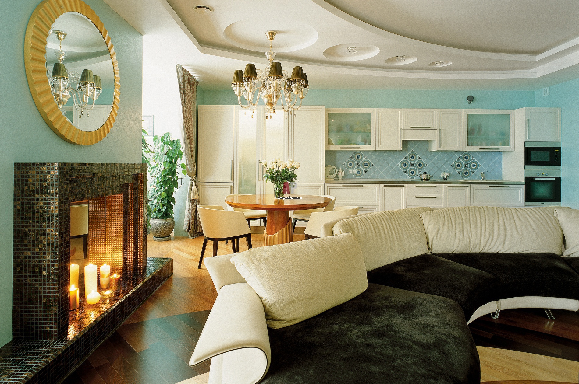 Кухня в общем пространстве гостиной. Лаконичные фасады выкрашены в цвет слоновой кости. Верхние навесные шкафы с матовым стеклом. Подвесной потолок сложной формы зонирует помещение.