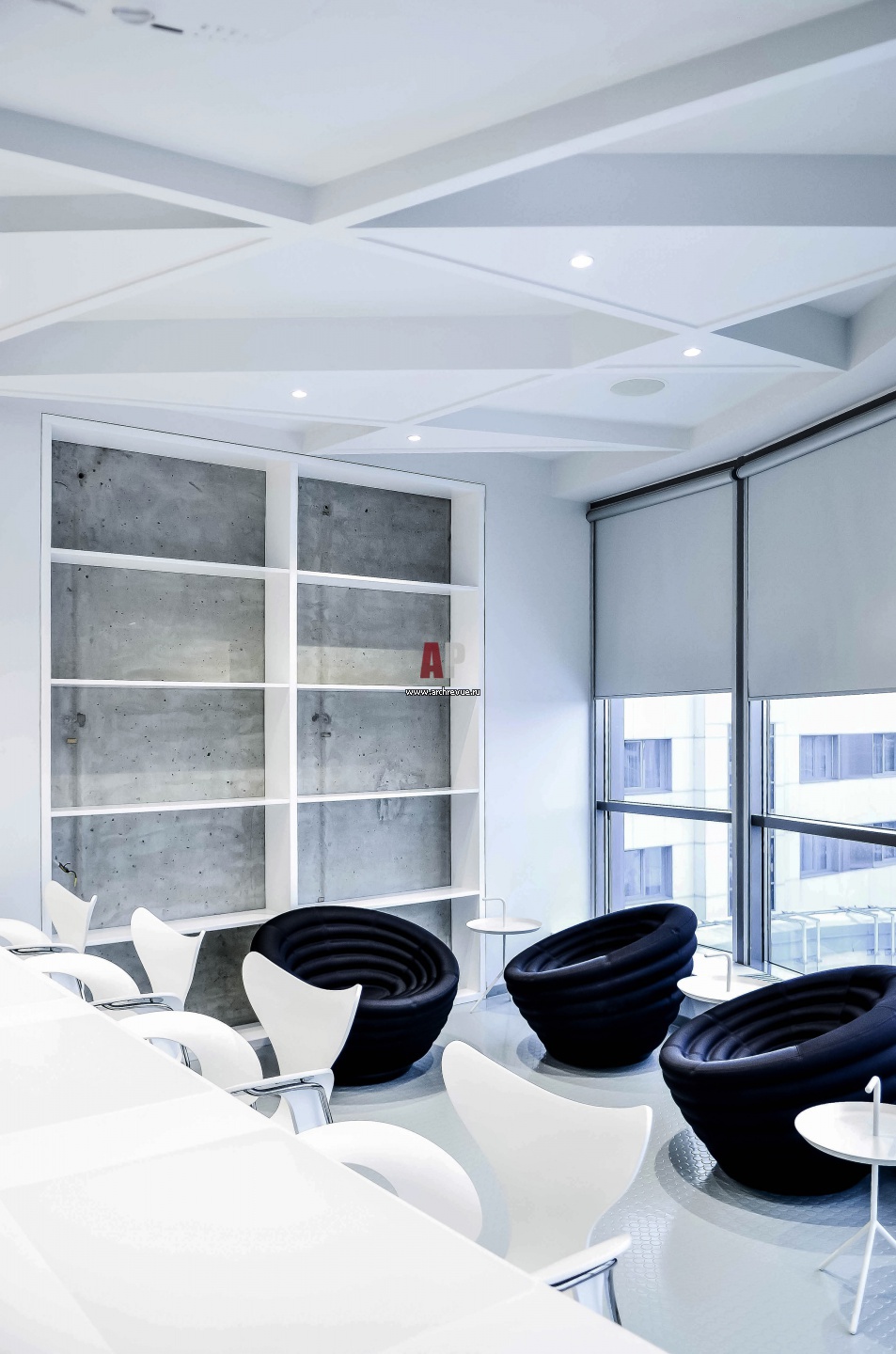 Зона отдыха с черными дизайнерскими креслами в кабинете руководителя. Внутренняя стенка стеллажа выполнена из серого войлока.