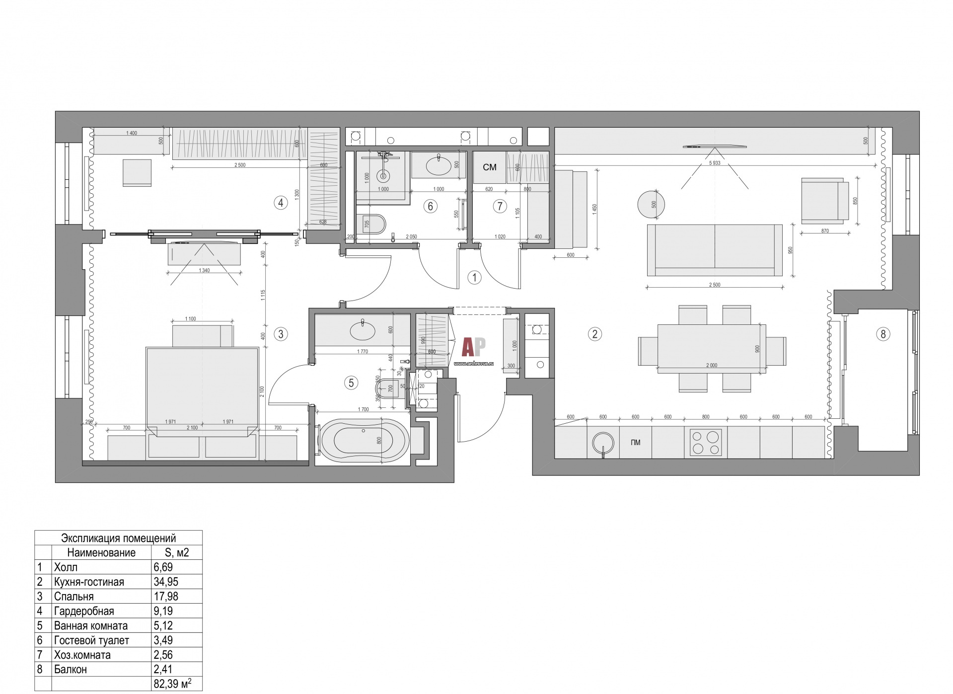 Планировка двухкомнатной квартиры в новостройке. Общая площадь – 86 кв. м.