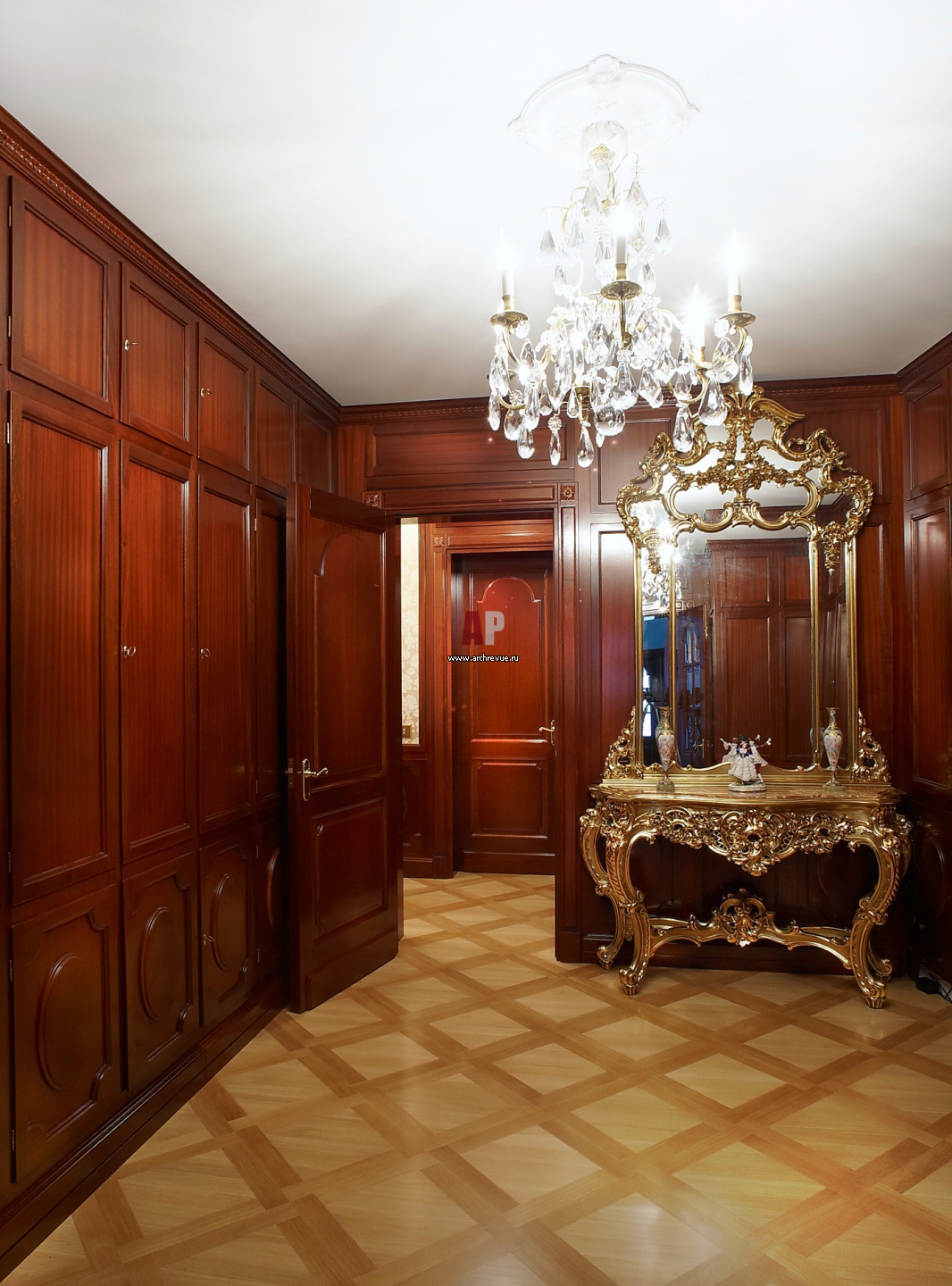 В холле применено сплошное панелирование. Панели из красного дерева, как и все межкомнатные двери, выполнены на заказ по чертежам Игоря Анурова итальянскими мебельщиками.