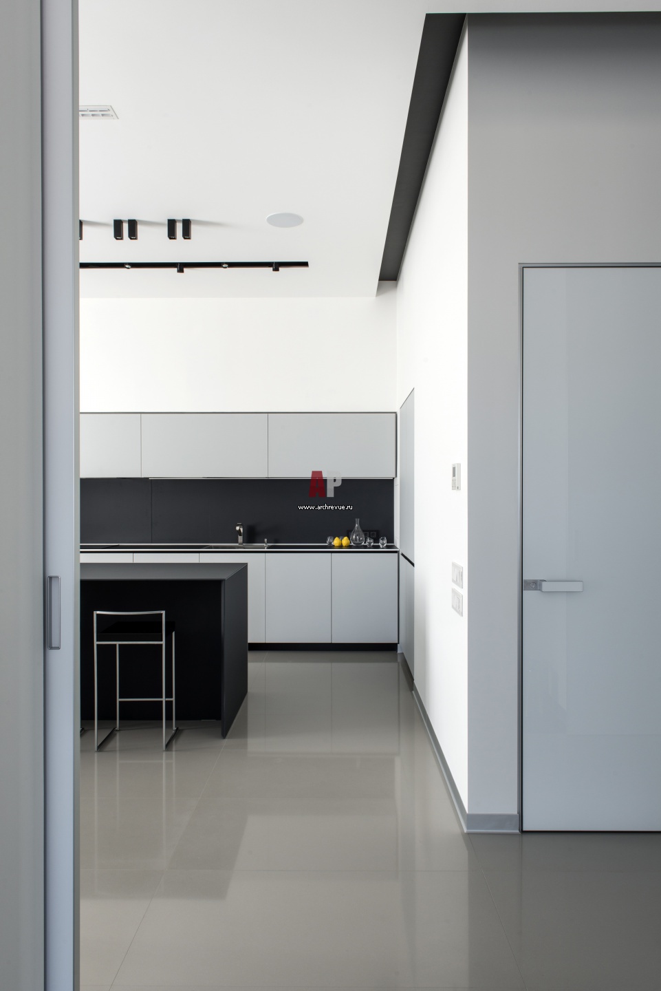 На полу кухни – крупноформатная плитка, имитирующая каменные слэбы. Глянцевый финиш обладает эффектом зеркала.