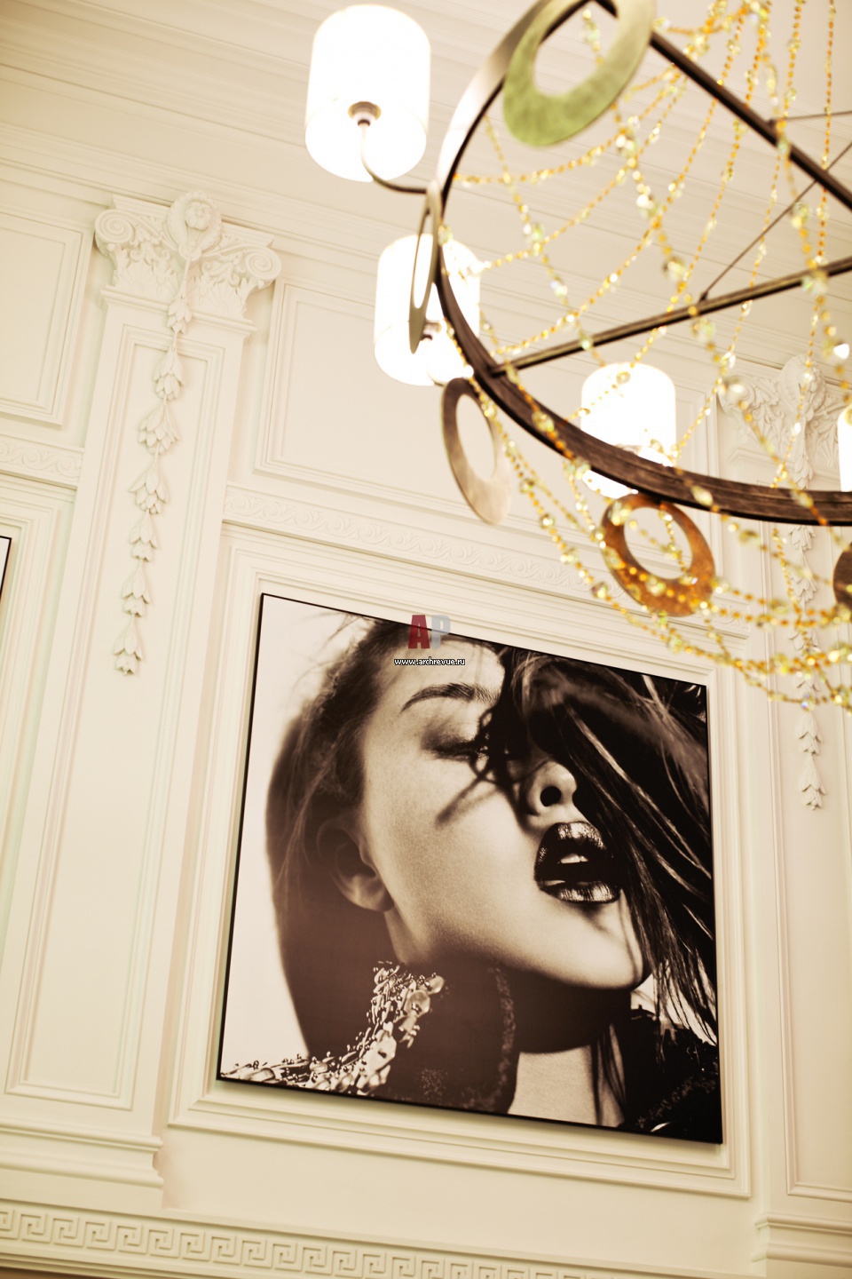 Фэшн-фотографии на фоне старинного лепного декора стен вносят в интерьер ноту гламура.