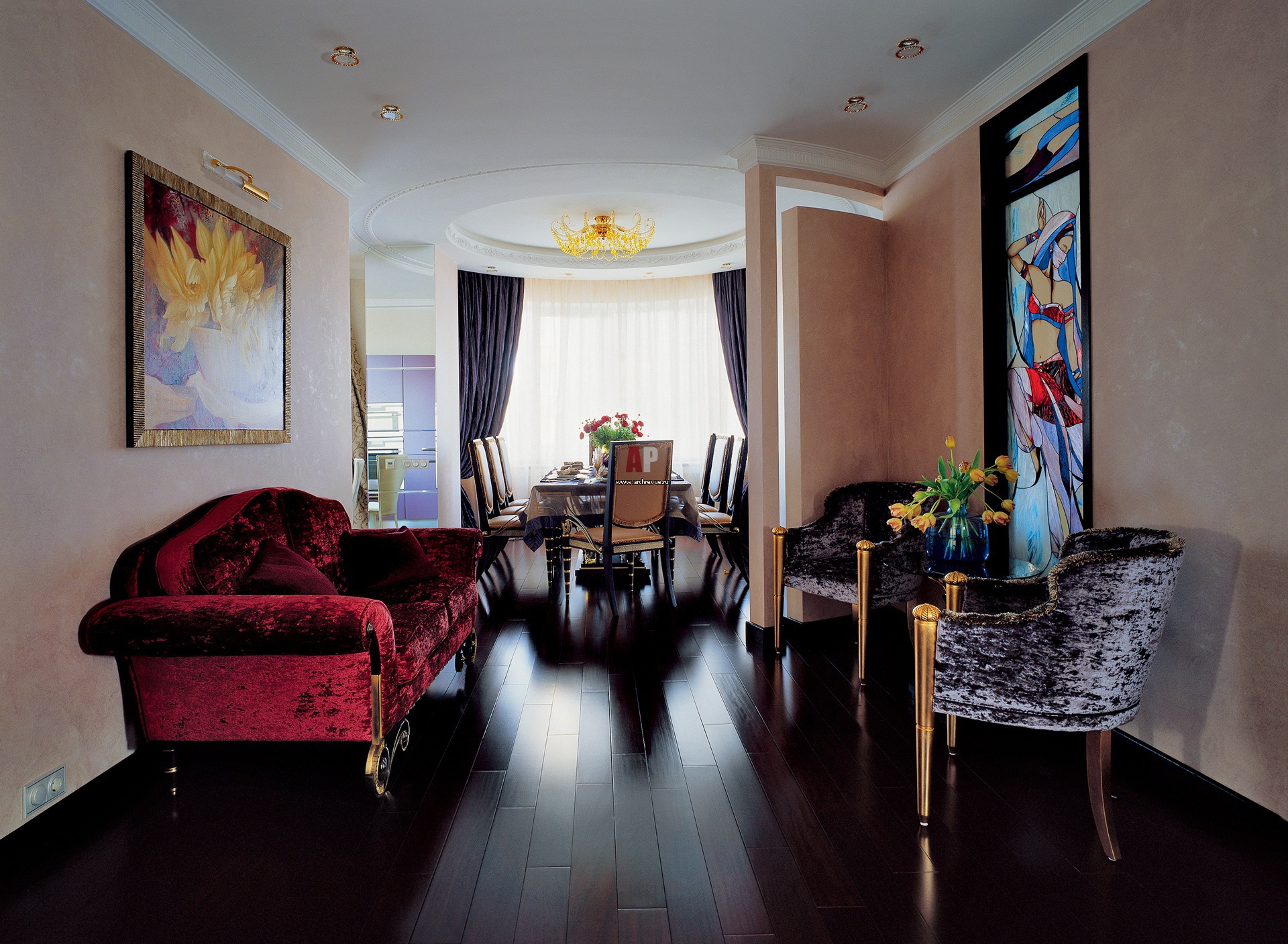 Интерьер гостиной. Декоративные простенки, колонны и пилоны акцентируют круговую композицию и уравновешивают вытянутые пропорции помещения. Украшение гостиной – художественный витраж их цветного стекла.