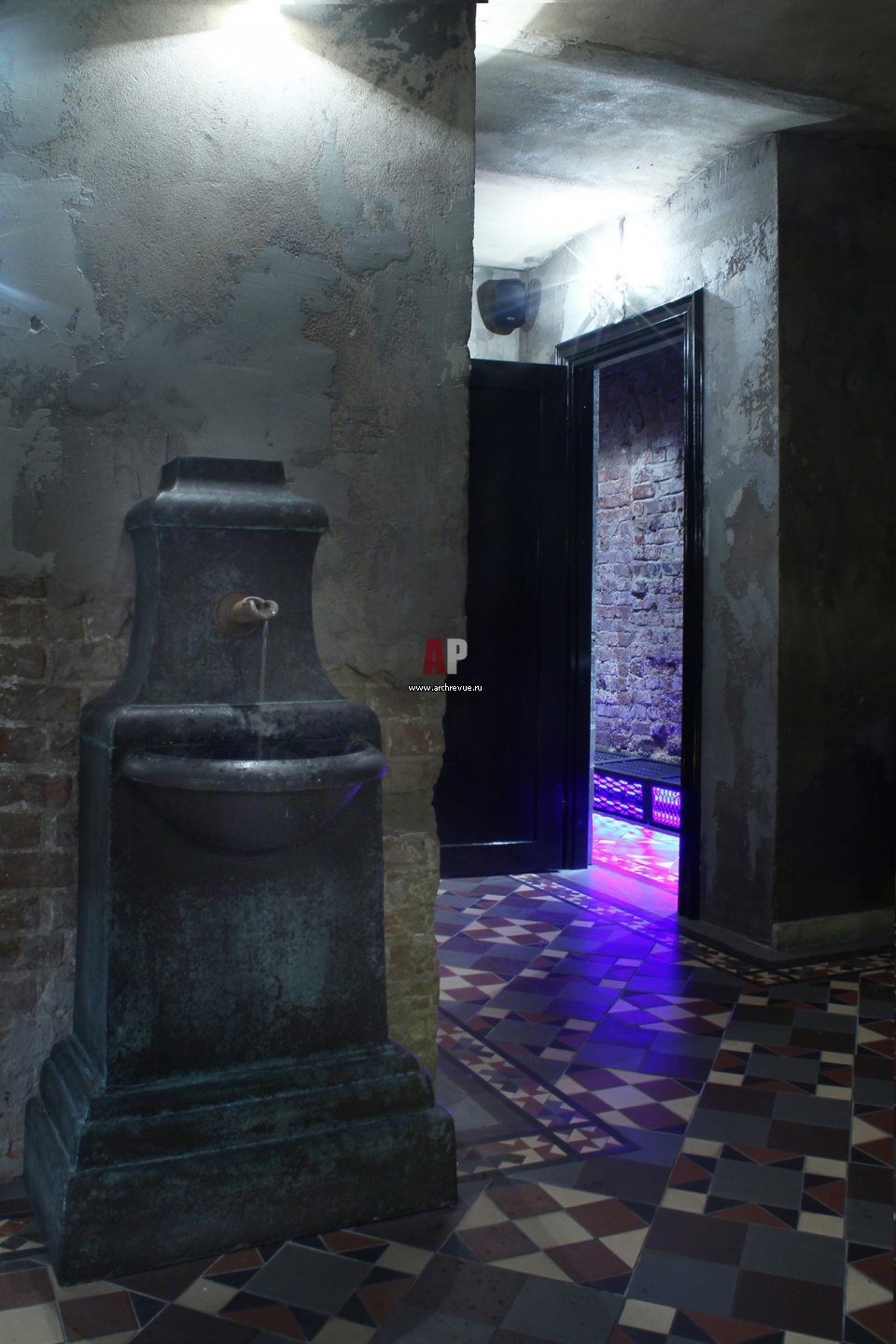 В холле установлен каменный водопад. На полу – панно из метлахской плитки четырех цветов: черного, белого, серого, красно-коричневого.