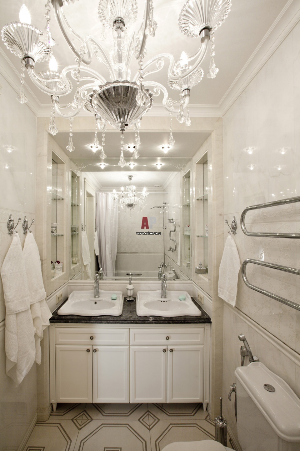 Интерьер санузла в классике. Белая глазурованная керамическая плитка с рельефным орнаментом. Светильник, прозрачное стекло.