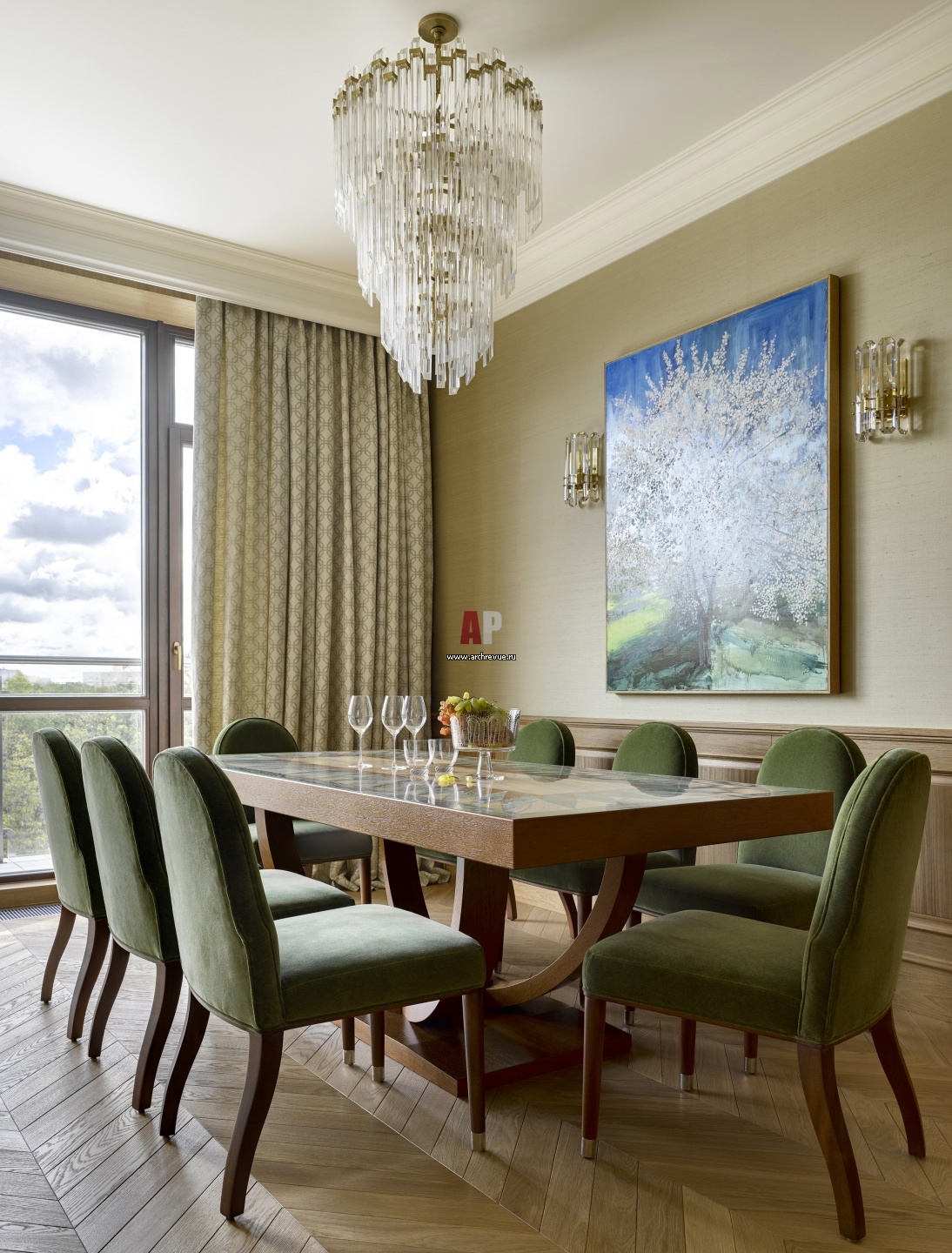 Зона столовой в общей гостиной. Обеденный стол, на заказ. Опора, подстолье из дерева, изготовление «Ассоциация русских мастеров». Столешница инкрустирована камнем (мрамором и ониксом) тех же сортов, что использованы в оформлении прихожей. Стулья, Baker.