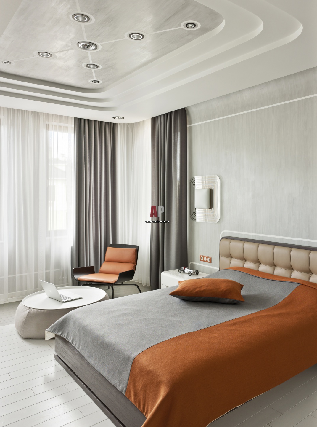 Интерьер спальни решен в стилистике футуризма и напоминает кабину космического корабля. Покрытие стен с вертикальным рисунком отливает глянцем, словно деталь металлической обшивки. Потолок оформлен геометрической разбивкой.