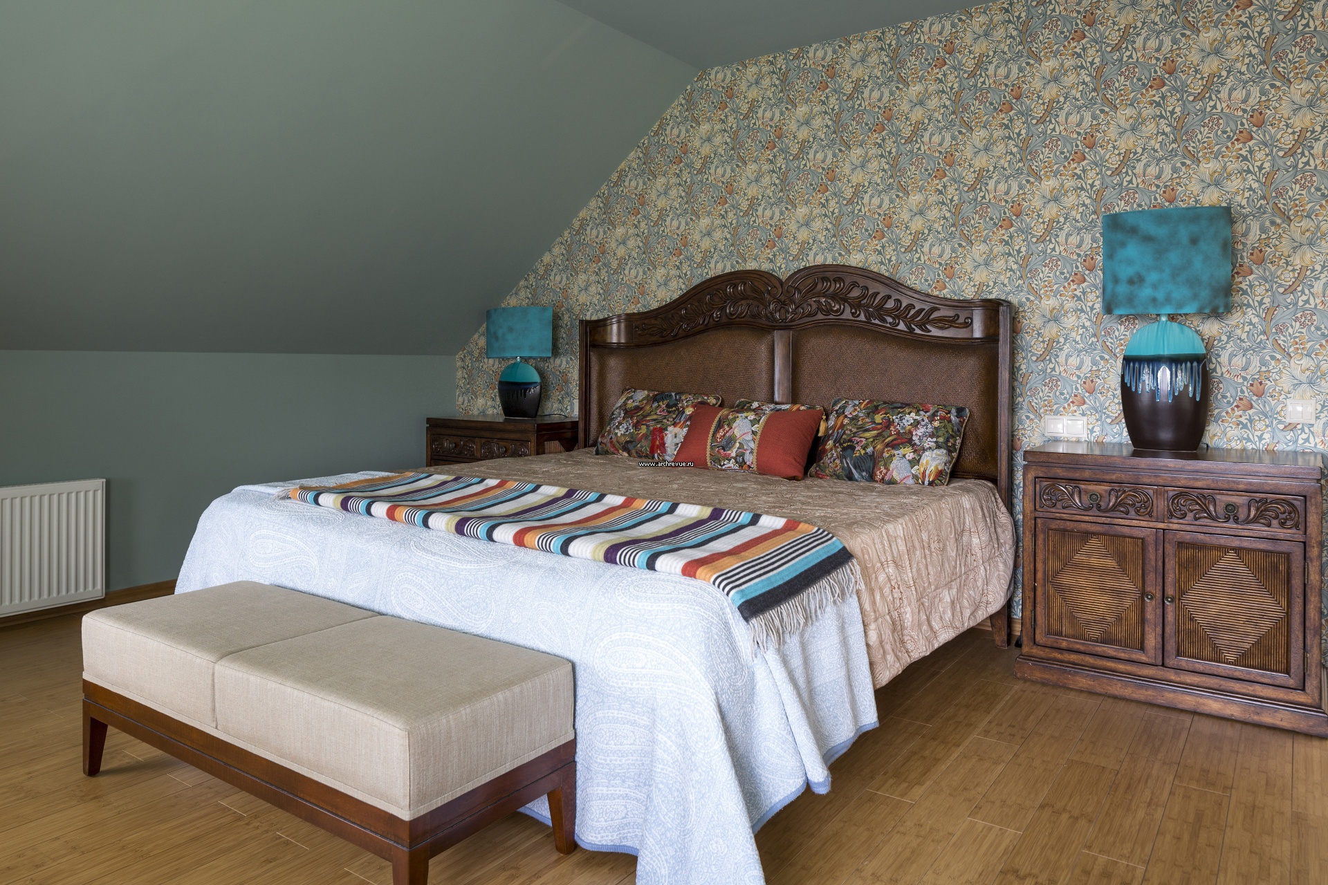 Спальня в мансарде с этническими мотивами. Стены и скосы потолка выкрашены в бирбзовый цвет, стена за кроватью оклеена английскими бумажными обоями с цветочным рисунком от Morris & Co, поставщик «Ампир Декор». Кровать и тумба в азиатском стиле перевезли из главного дома. Пол выложен паркетной доской из бамбука.