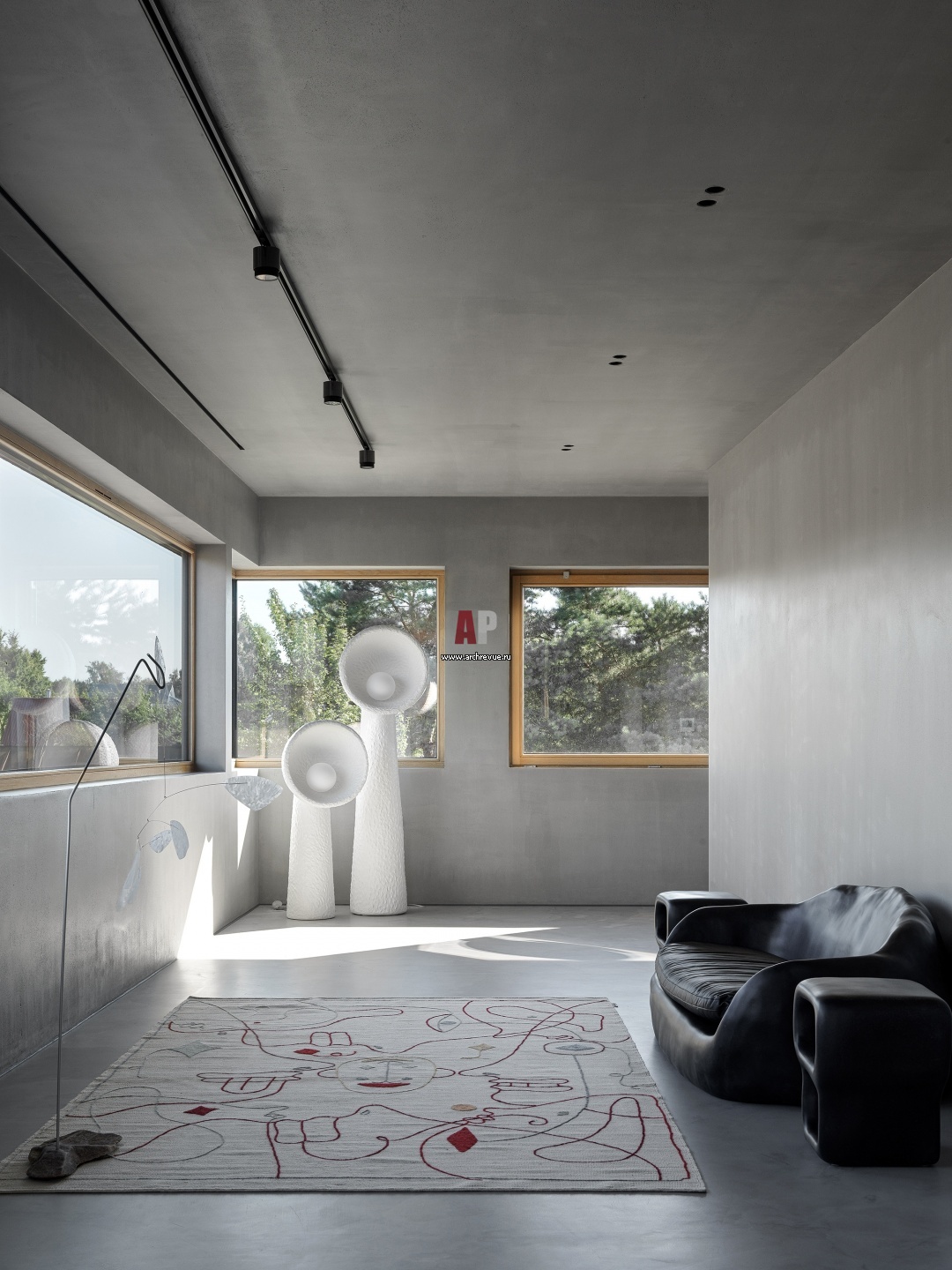 Артистический бетонный дом в Подмосковье. Галерея второго этажа. Мебель, Kar Studio. Ковер по дизайну Хайме Айона. Светильники, Olga Engel Design.