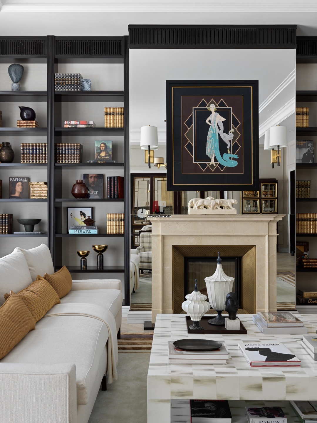 Интерьер гостиной. Камин выполнен из мрамора с латунной топкой. Над камином – работа Эрте «Калифорния». Книжный стеллаж изготовлен по чертежам авторы проекта. На полках – японская бронза.